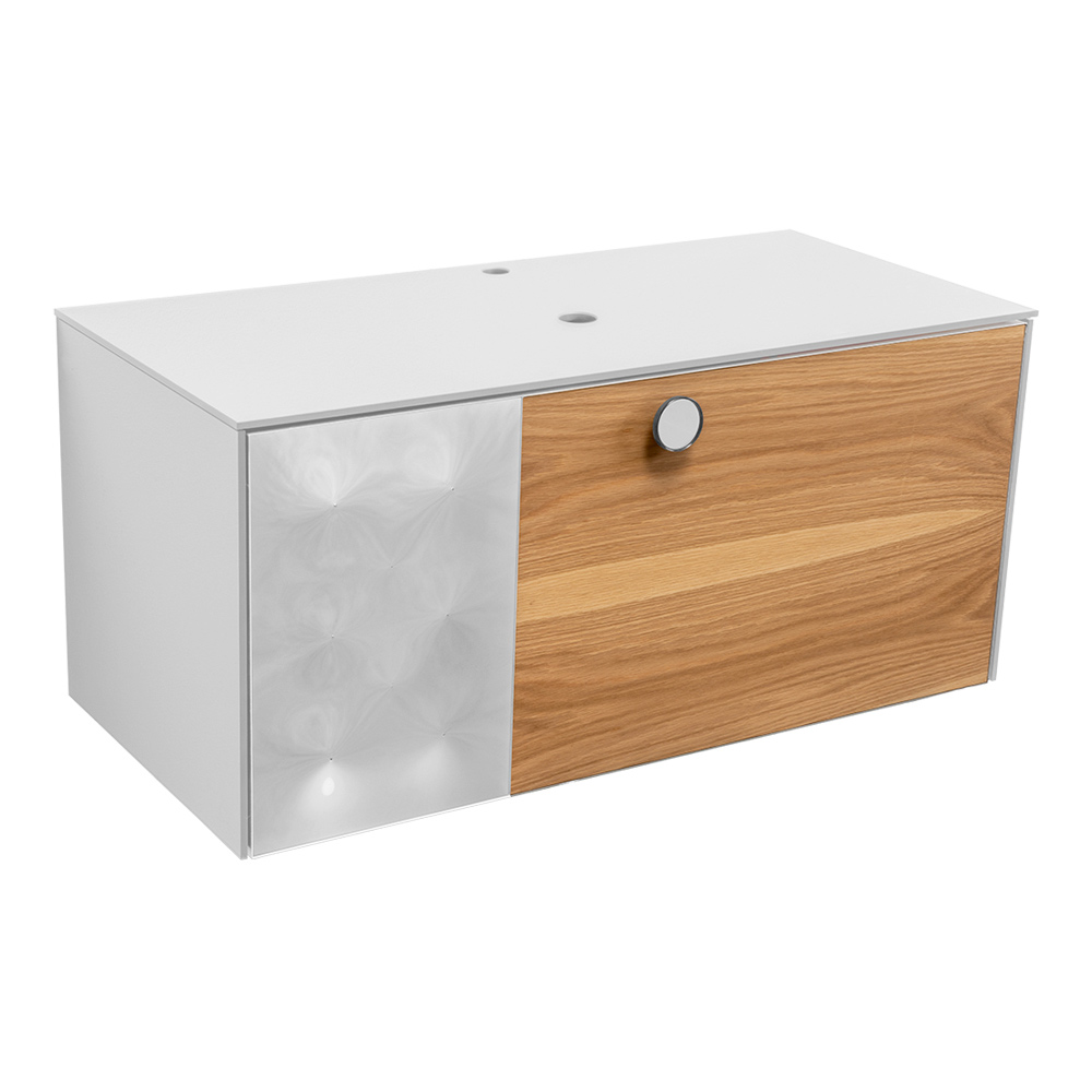 Det ophængte modul kan prale af en indvendig skuffe : den første med en reserve til afløb, udstyret med skillevægge og et frontpanel i egetræ, og den anden med et stort opbevaringsrum.