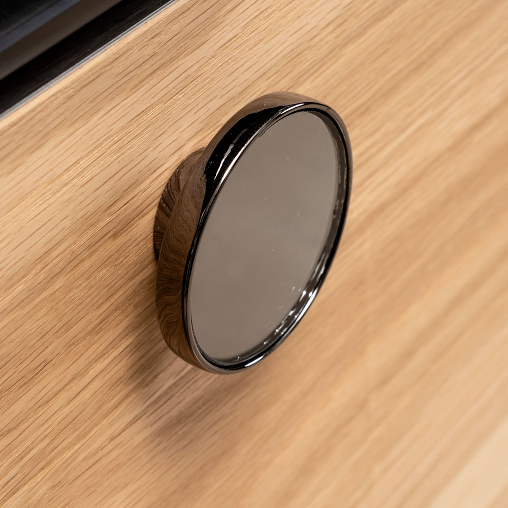 Den ydre skuffe har et poleret metalhåndtag med et spejl i samme finish.
