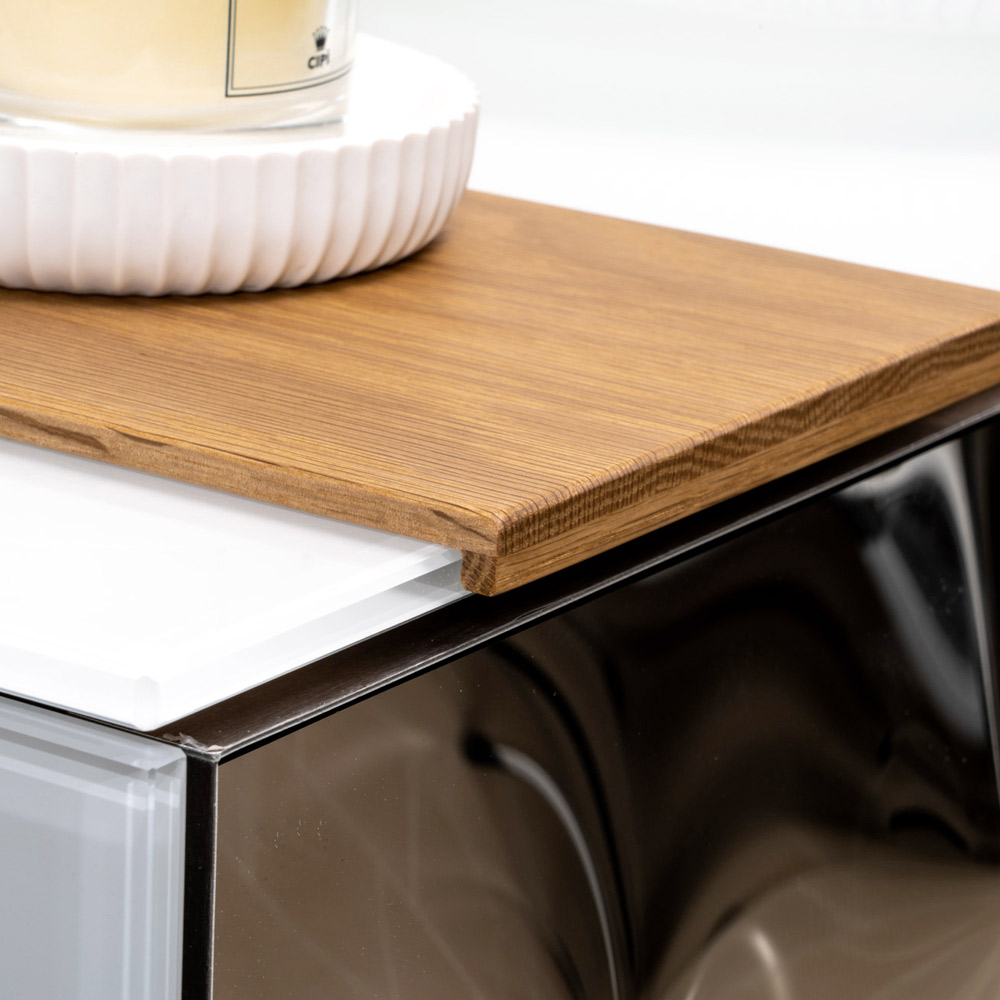 Den centrale del i naturtræ med synlig åretegning kombineres harmonisk med toppen og siderne, som er lavet af 8 mm ekstra klart hærdet farvet glas . Skuffens sideindsats er i buet glas , der er kendetegnet ved en tredimensionel effekt med lysende refleksioner, hvilket beriger designet med en karakteristisk og raffineret detalje.