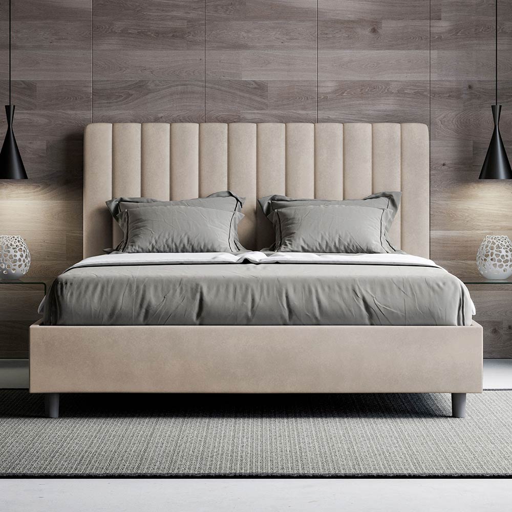 Fransk seng 140x200 cm polstret lavet af melaminpaneler og betrukket med mikrofiber , helt fremstillet i Italien. Denne franske seng med polstret sengeramme er ideel til dem, der søger et blikfang uden at være overdrevent anmassende. Sengen har en minimalistisk hovedgærde med en delikat quiltet effekt af symmetriske lodrette linjer , der passer smukt ind i enhver indretning, uanset om den er moderne eller klassisk.