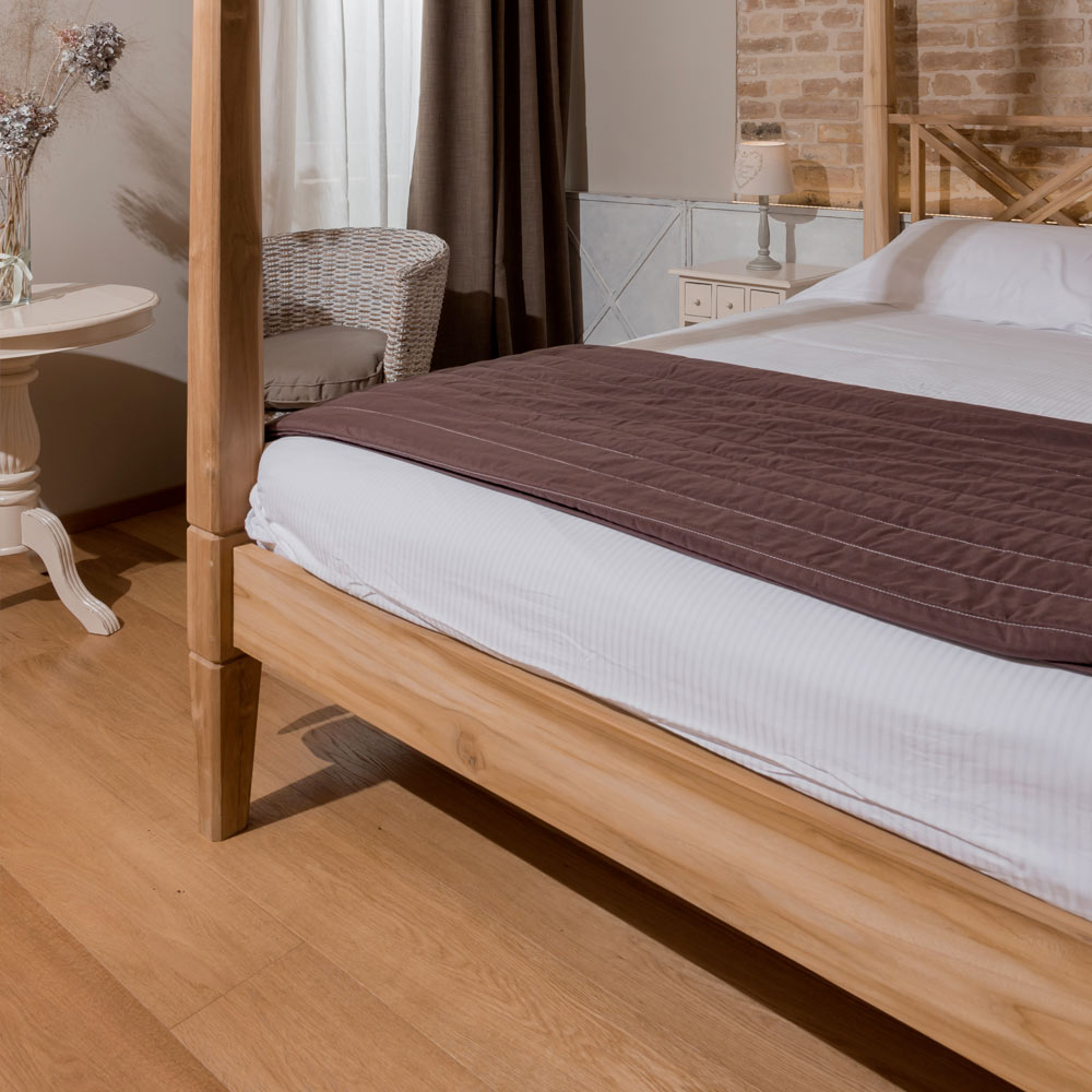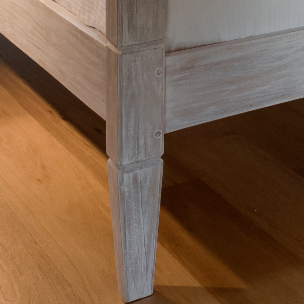 Sengen er håndlavet af naturligt tørret træ, et levende materiale, der kan bevæge sig naturligt over tid. Eventuelle små revner eller skrammer er naturligt forekommende i træet og kan endda opstå med tiden.