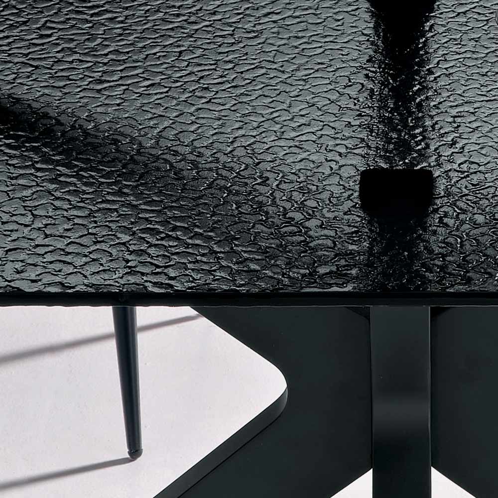 Den solide sortmalede metalbase sikrer stabilitet og holdbarhed og fuldender designet med et moderne og essentielt præg. Kombinationen af dekoreret glas og metalramme skaber en perfekt balance mellem elegance og funktionalitet, hvilket gør bordet velegnet til både hjemlige og moderne rum.