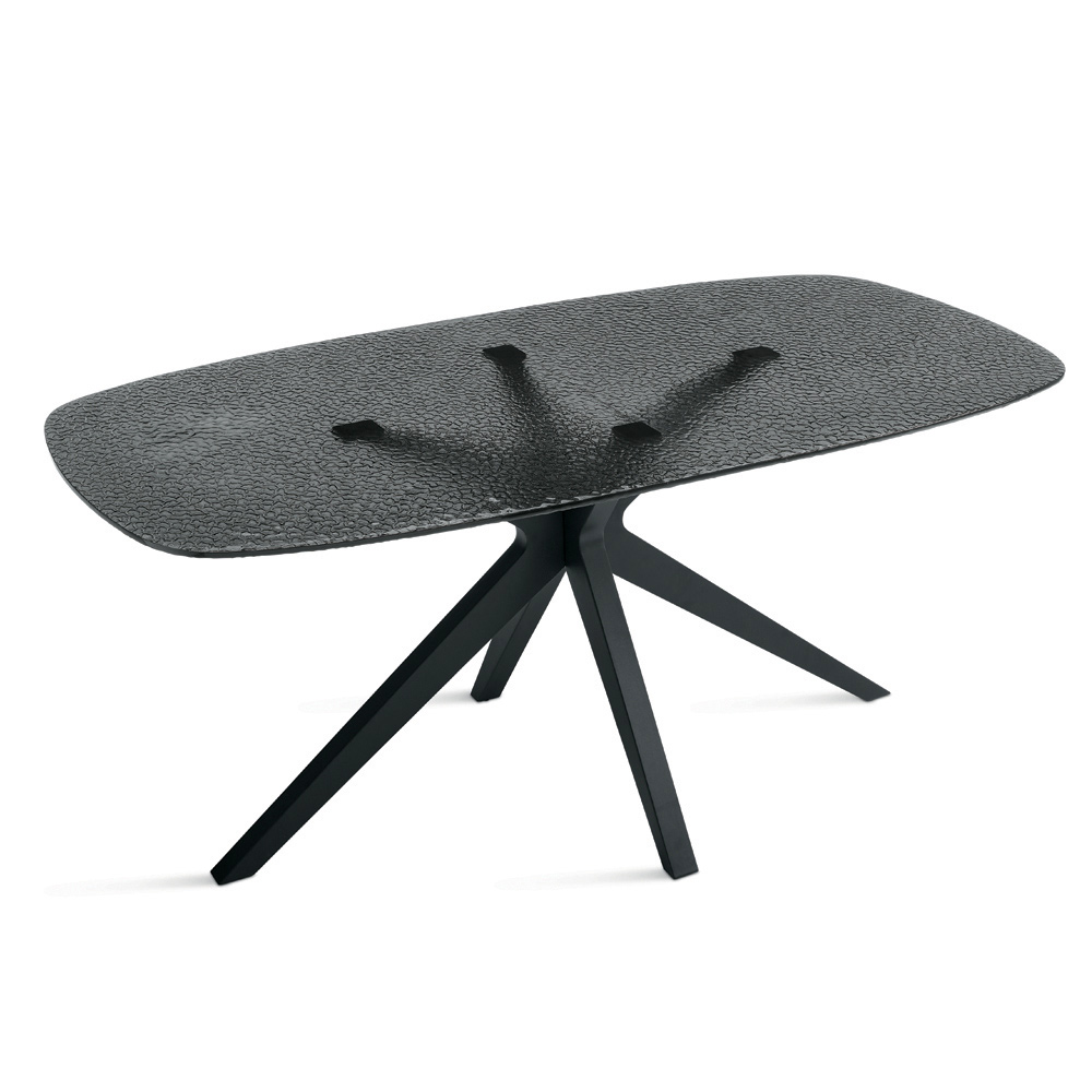 Et elegant ovalt spisebord med et moderne design, ideelt til at tilføje et stilfuldt præg til din spisestue eller stue . Bordpladen er lavet af røget, hamret glas , en raffineret finish, der skaber en unik tekstureret effekt og tilføjer visuel dybde til rummet.