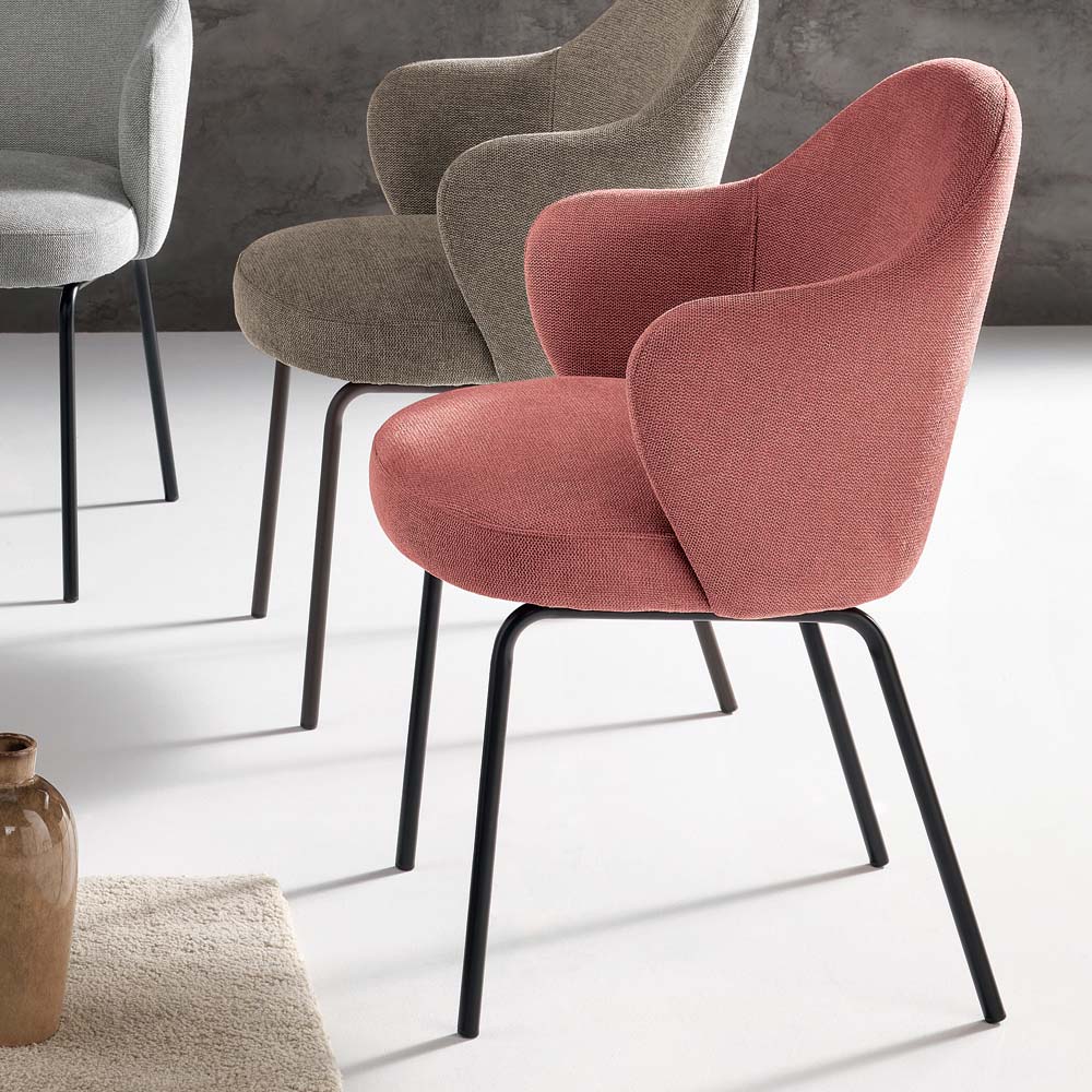 Stolen har en buet, kontinuerlig ryglæn , der forsigtigt åbner sig i to afrundede armlæn , hvilket giver en imødekommende følelse både visuelt og funktionelt. Det fjedrede sæde sikrer høj komfort, selv ved længere tids brug.