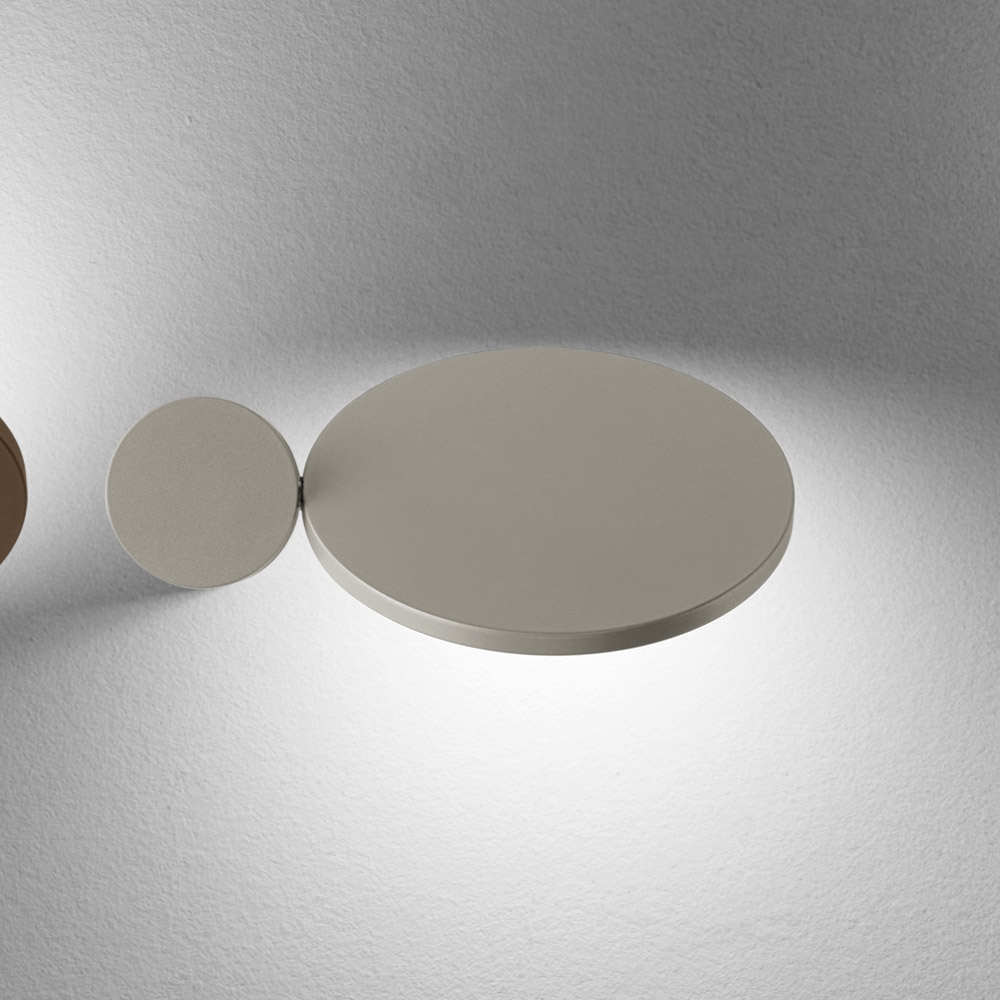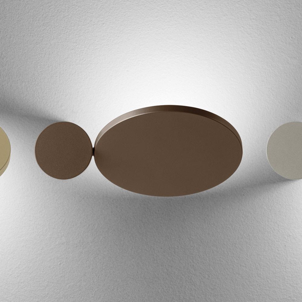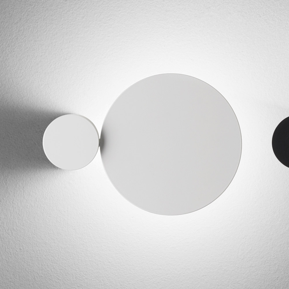 Denne væglampe er et sandt lysende kunstværk , der blander grafisk design og dekorativ funktion i én gestus. Den er sammensat af essentielle geometriske former og leger med overlappende skiver og ovaler , der, når de tændes, skaber en blød og dramatisk lyseffekt på væggen.
