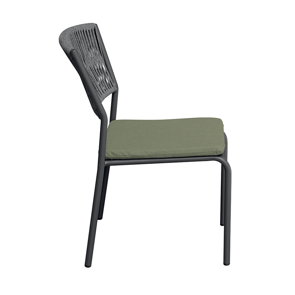 Det udendørs reb-ryglæn giver et raffineret, moderne touch, der sikrer komfort og åndbarhed, mens aluminiumssædet med matchende hynde tilbyder blødhed og komfort, hvilket gør hvert øjeblik med afslapning endnu mere behageligt.