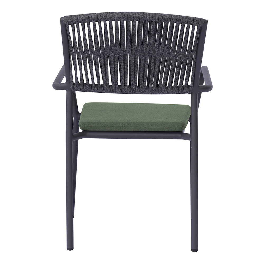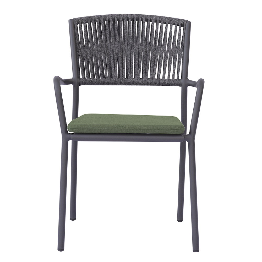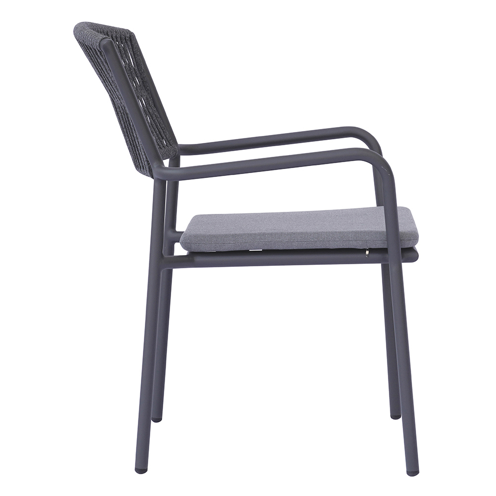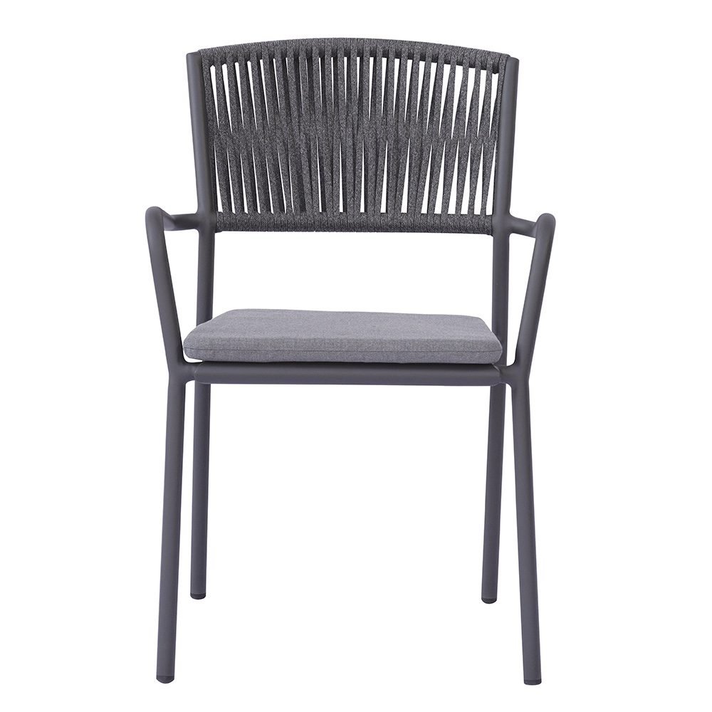 Det udendørs reb-ryglæn giver et raffineret, moderne touch, der sikrer komfort og åndbarhed, mens aluminiumssædet med matchende hynde tilbyder blødhed og komfort, hvilket gør hvert øjeblik med afslapning endnu mere behageligt.