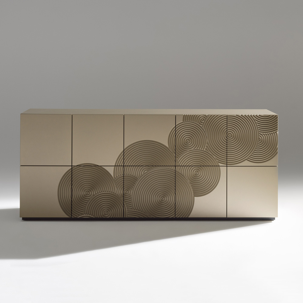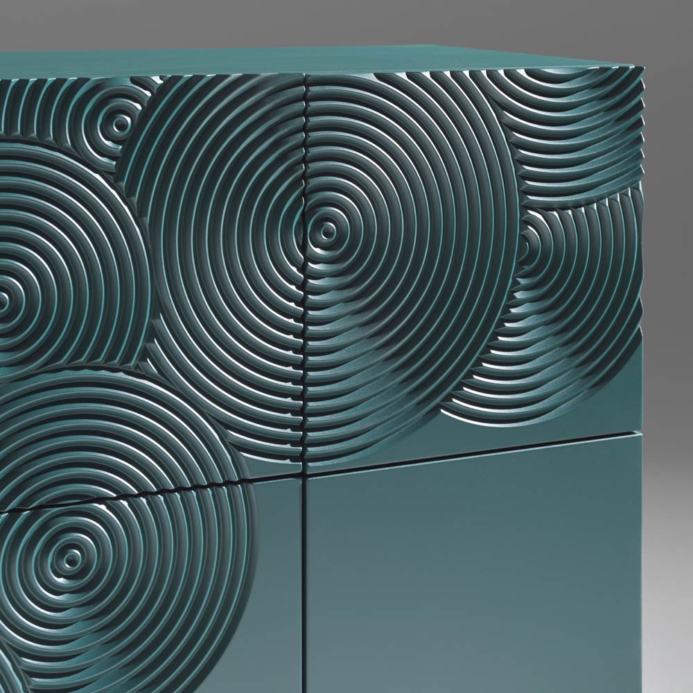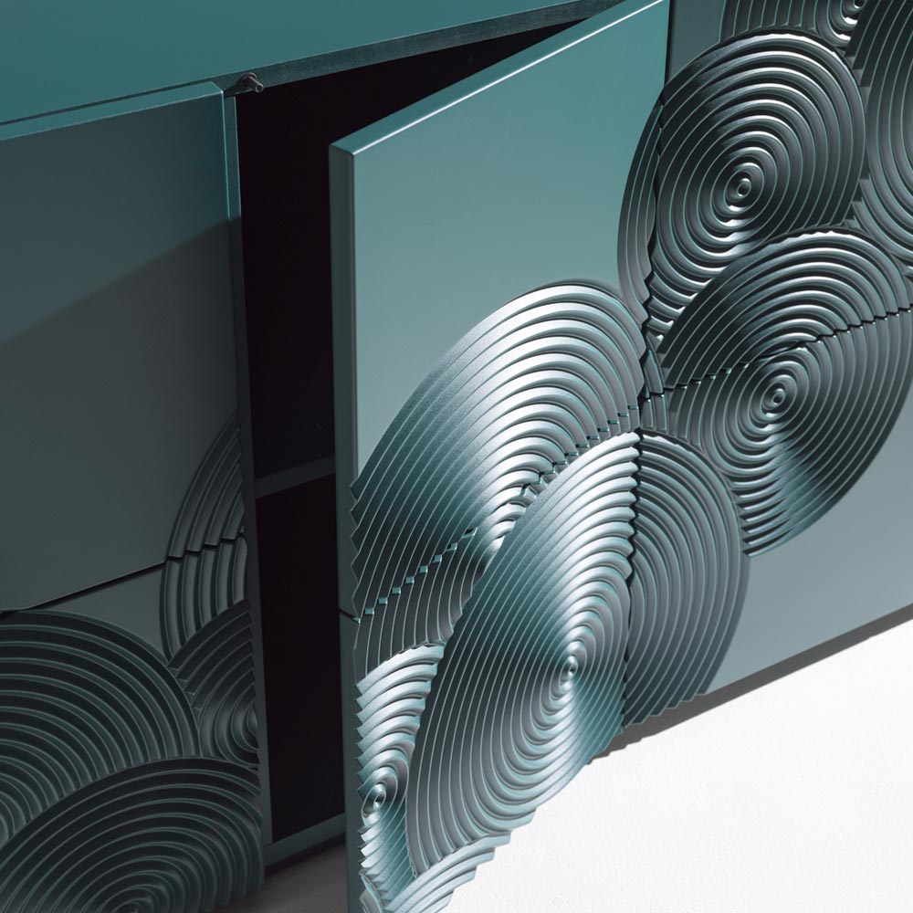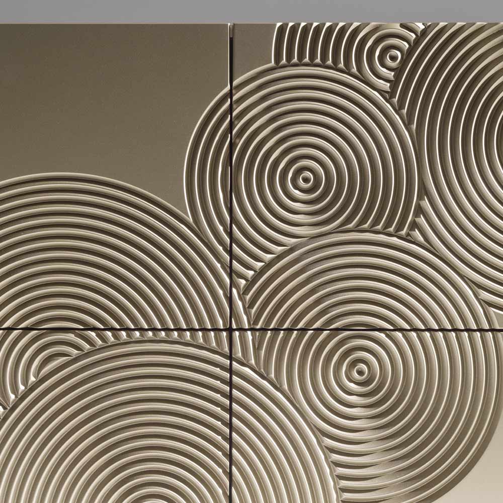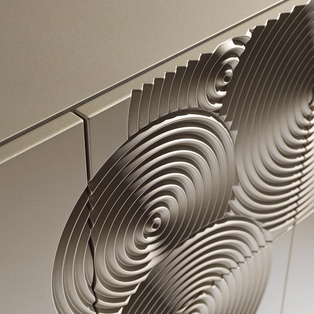 En skænk med en stærk visuel effekt, kendetegnet ved en raffineret dekoration graveret med et cirkulært motiv og færdiggjort helt i hånden , der er i stand til at skabe suggestive spil af lys og skygge på overfladen.