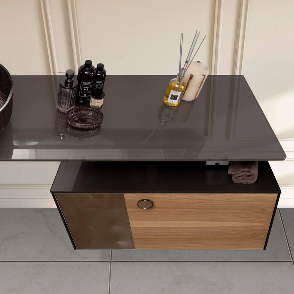 Den centrale del i naturtræ med synlig åretegning kombineres harmonisk med toppen og siderne, som er lavet af 8 mm ekstra klart hærdet farvet glas . Skuffens sideindsats er i buet glas , der er kendetegnet ved en tredimensionel effekt med lysende refleksioner, hvilket beriger designet med en karakteristisk og raffineret detalje.