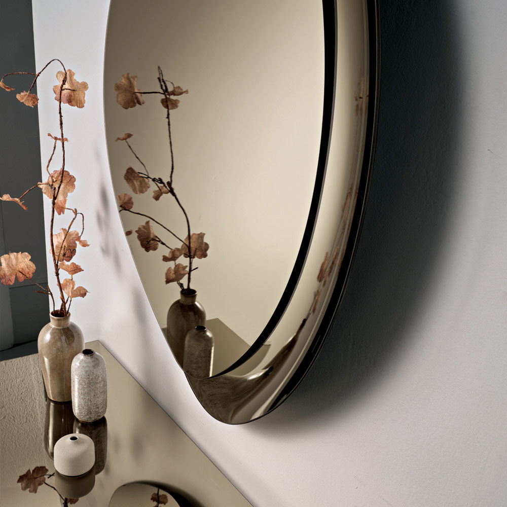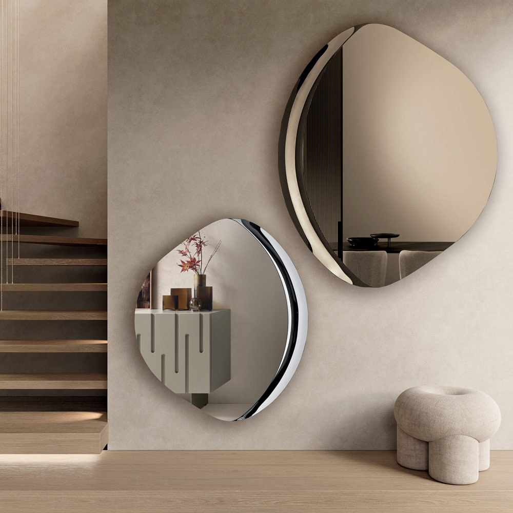 Designet har en karakteristisk halvramme i tone-i-tone smeltet glas , der delvist indrammer den reflekterende overflade. Denne detalje tilføjer tekstur og lysstyrke og skaber et fængslende spil af refleksioner, der giver spejlet dybde og karakter.