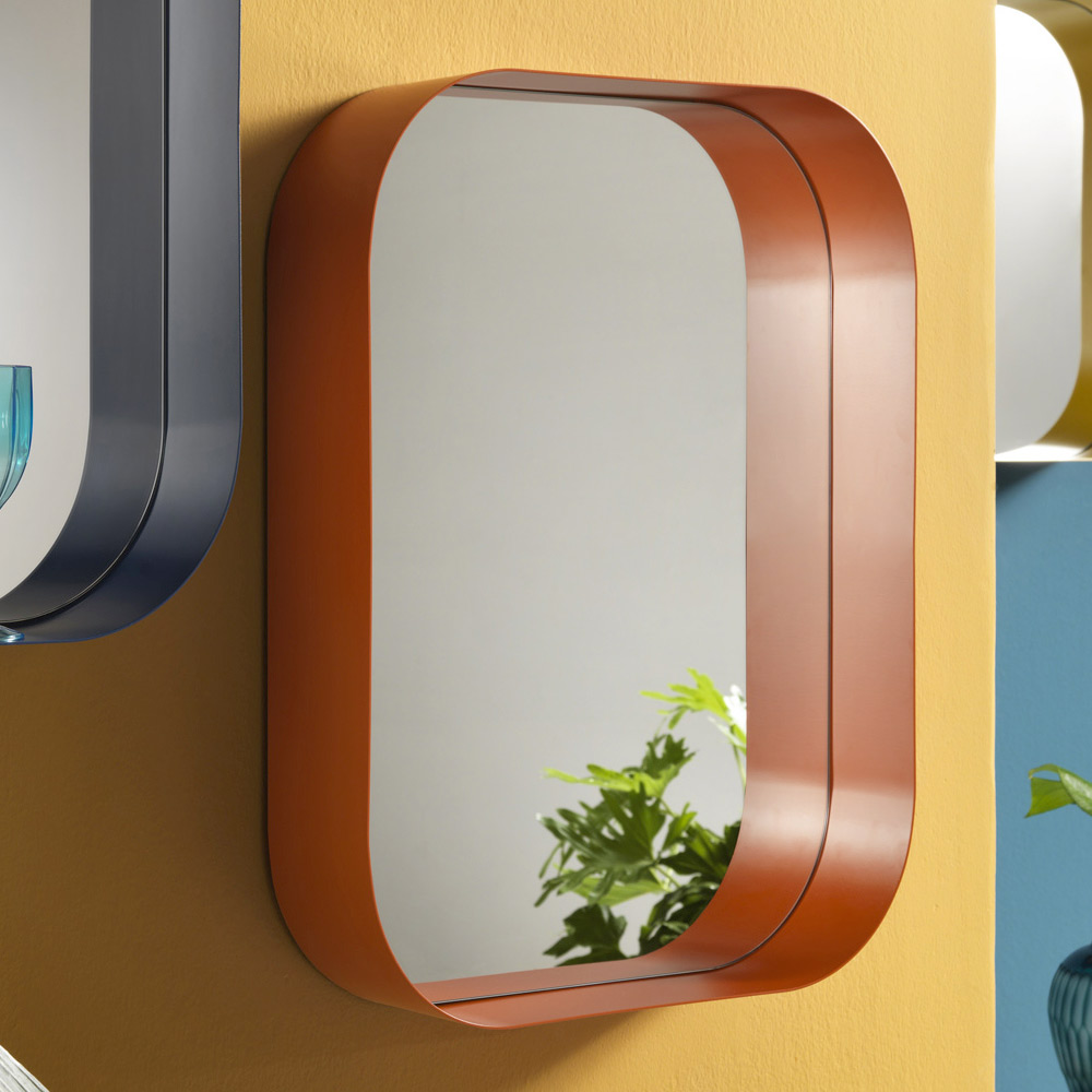 Dette store og pæne vægspejl i rektangulært design med afrundede hjørner er kendetegnet ved metalkanten, der rammer spejlet ind og fungerer som en praktisk og farverig hylde på 12,50 cm.