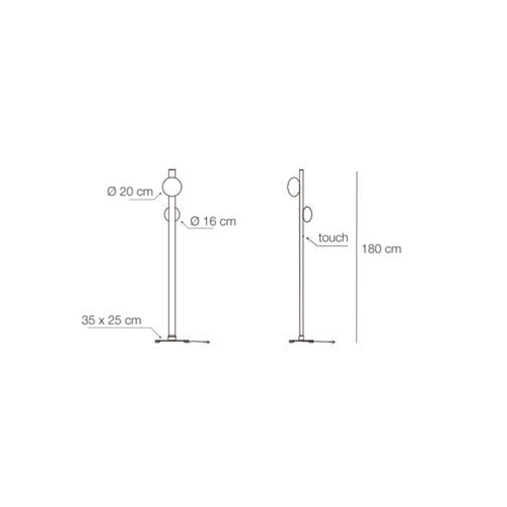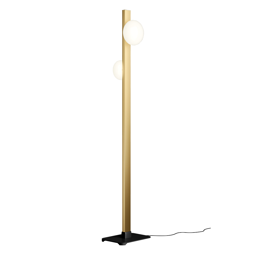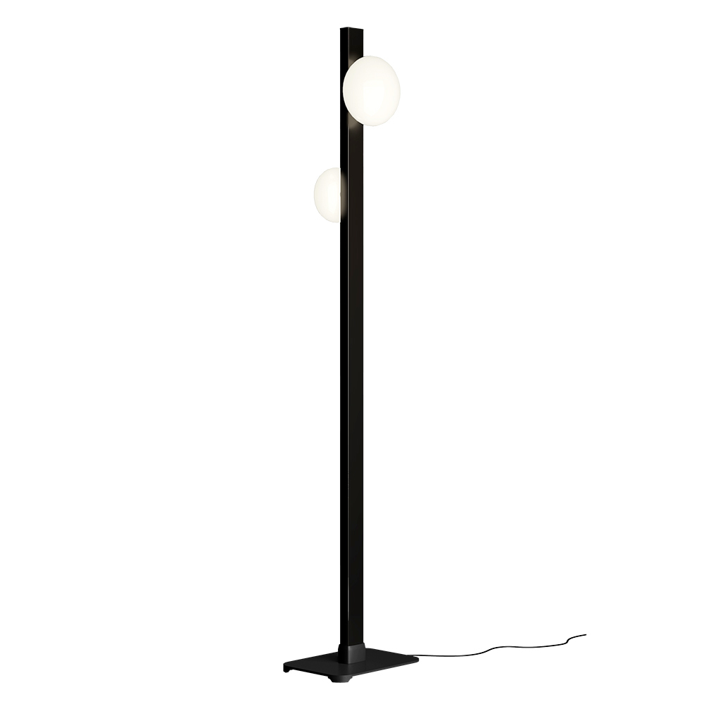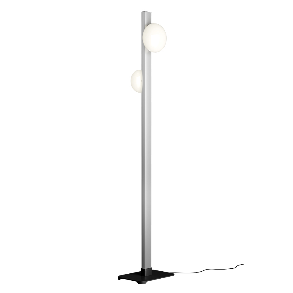 Denne gulvlampe er en perfekt balance mellem skulpturelt design og funktionel elegance , ideel til at forbedre ethvert rum med en moderne og raffineret stil. Den slanke, geometriske vertikale struktur huser to sfæriske opalglasdiffusorer , der fremstår ophængt i perfekt balance og afgiver et blødt, omsluttende lys.