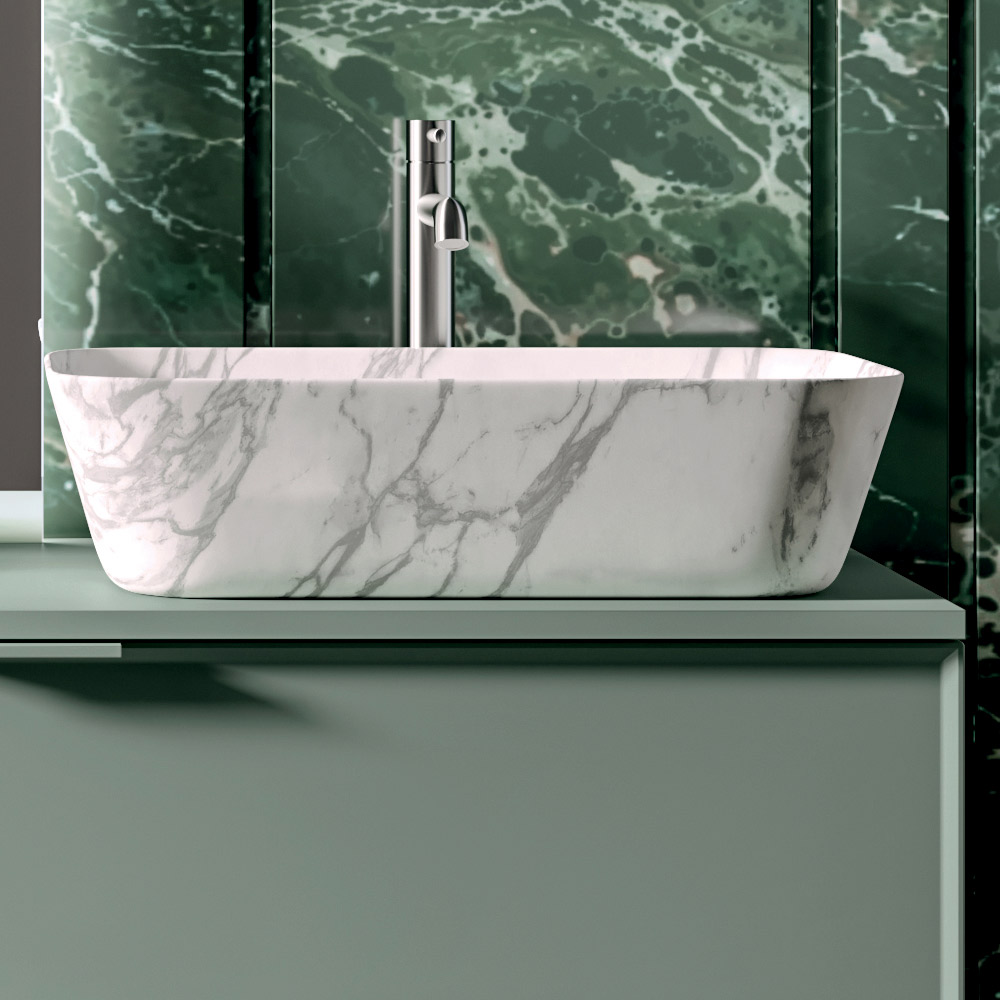 Den keramiske bordvask med Calacatta-look introducerer et yderst værdifuldt materialeelement med delikate årer, der minder om naturlig marmor og forskønner hele badeværelsesindretningen.