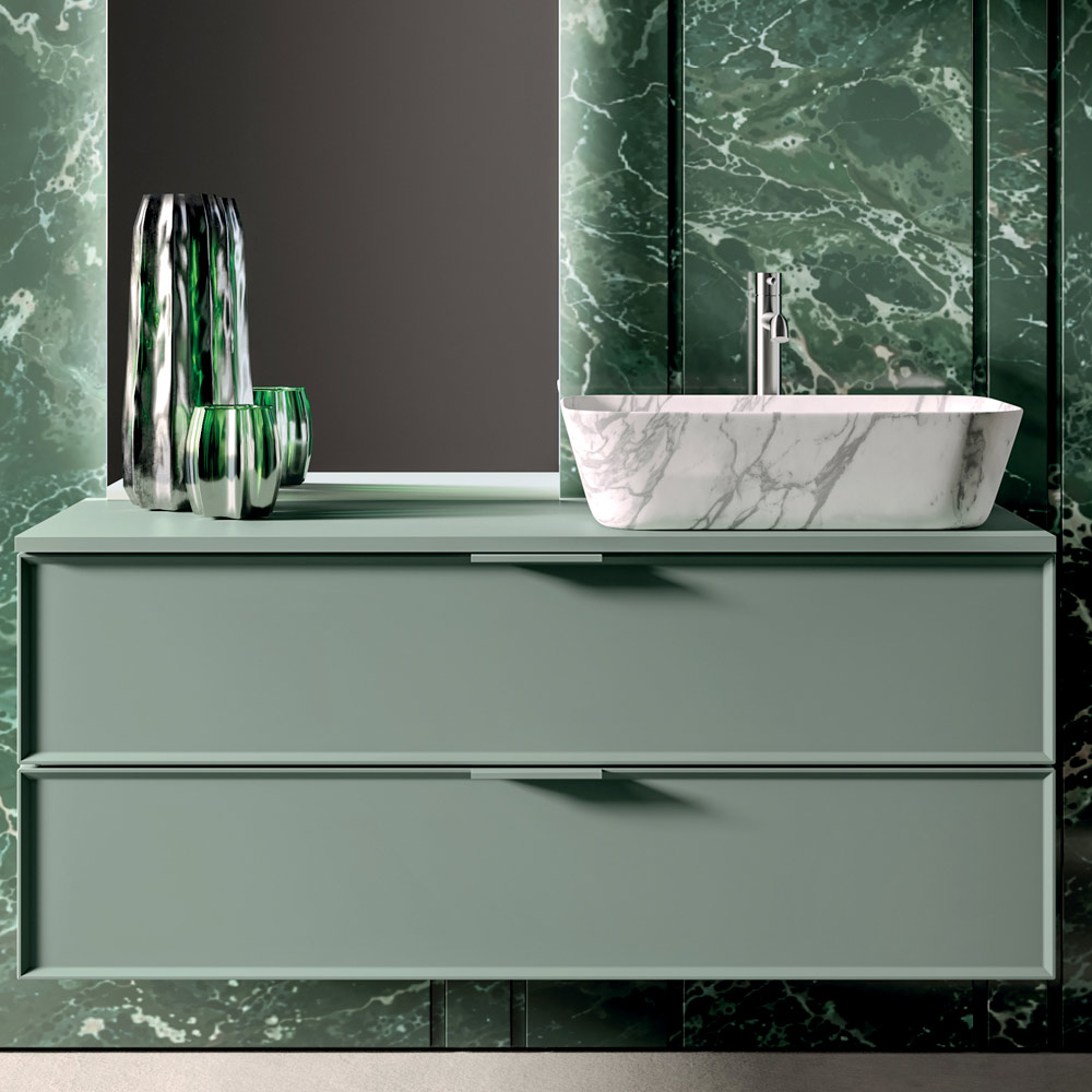 Raffineret badeværelseskomposition med et moderne design , kendetegnet ved rene linjer og en naturlig, afslappende farvepalet. Den matte salviefinish giver rummet et moderne og elegant look, perfekt til trendy badeværelser .