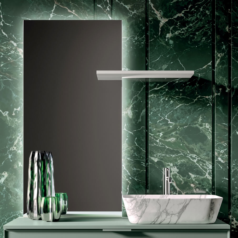 Badeværelsesspejlet med tresidet LED-belysning , udstyret med touch-betjening , garanterer et diffust og funktionelt lys, ideelt til daglig komfort og til at skabe en elegant og indbydende atmosfære.