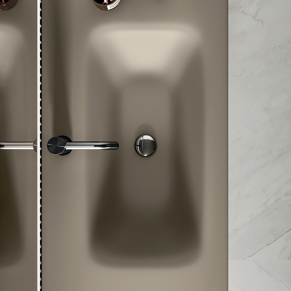 Den satinerede glasvask i duegrå skaber et raffineret tone-i-tone-spil med basen, hvilket fremhæver den visuelle lethed i hele kompositionen og giver lysstyrke til vaskeområdet.