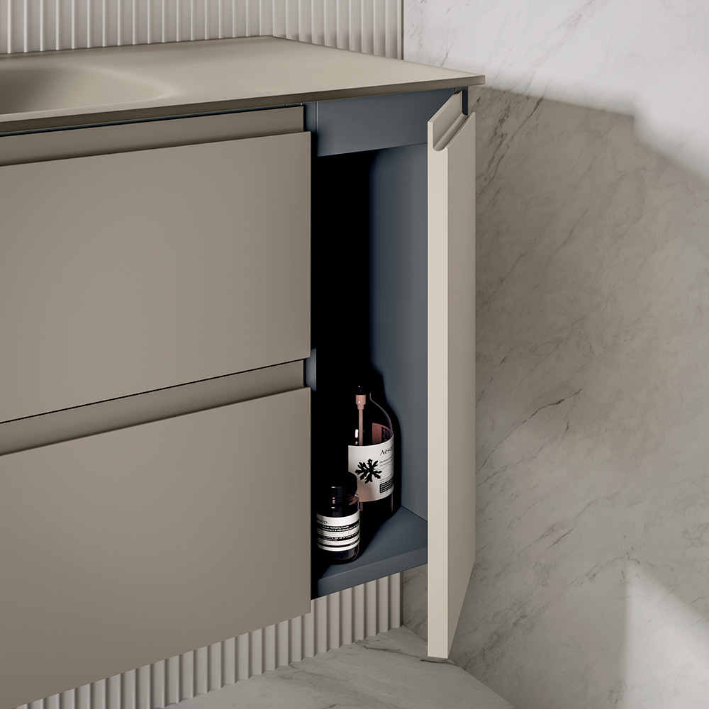 Det 120 cm store underskab med to skuffer og en højre sidedør i en mat duegrå finish tilbyder rigelig opbevaringskapacitet, samtidig med at det bevarer en raffineret, moderne æstetik. Den integrerede dørkonfiguration sikrer større funktionalitet og organisering af det indvendige rum.