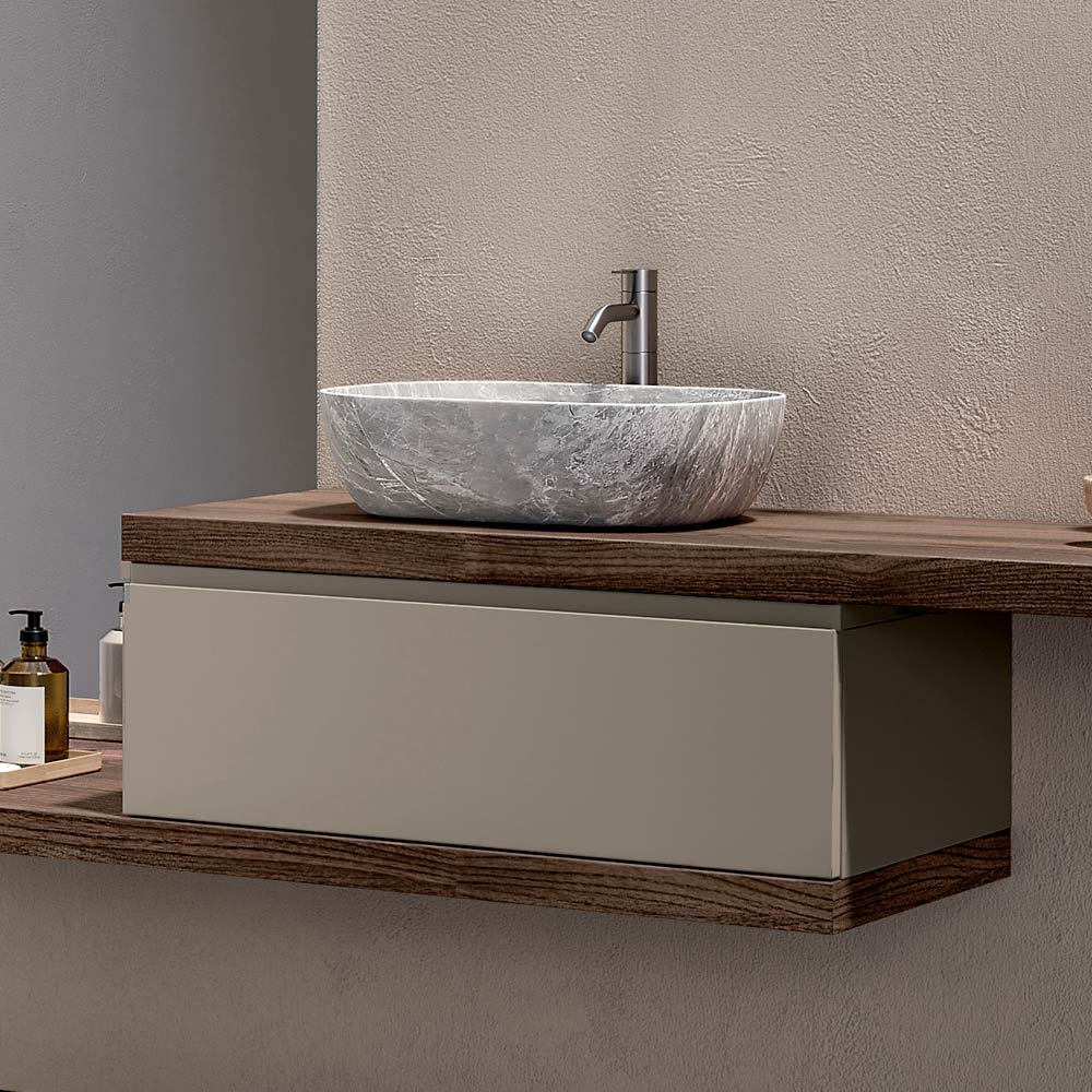 En komplet badeværelsesløsning designet til dem, der ønsker et moderne, nedhængt badeværelsesskab , kendetegnet ved varme finish, delikate kontraster og en stærk æstetisk identitet.