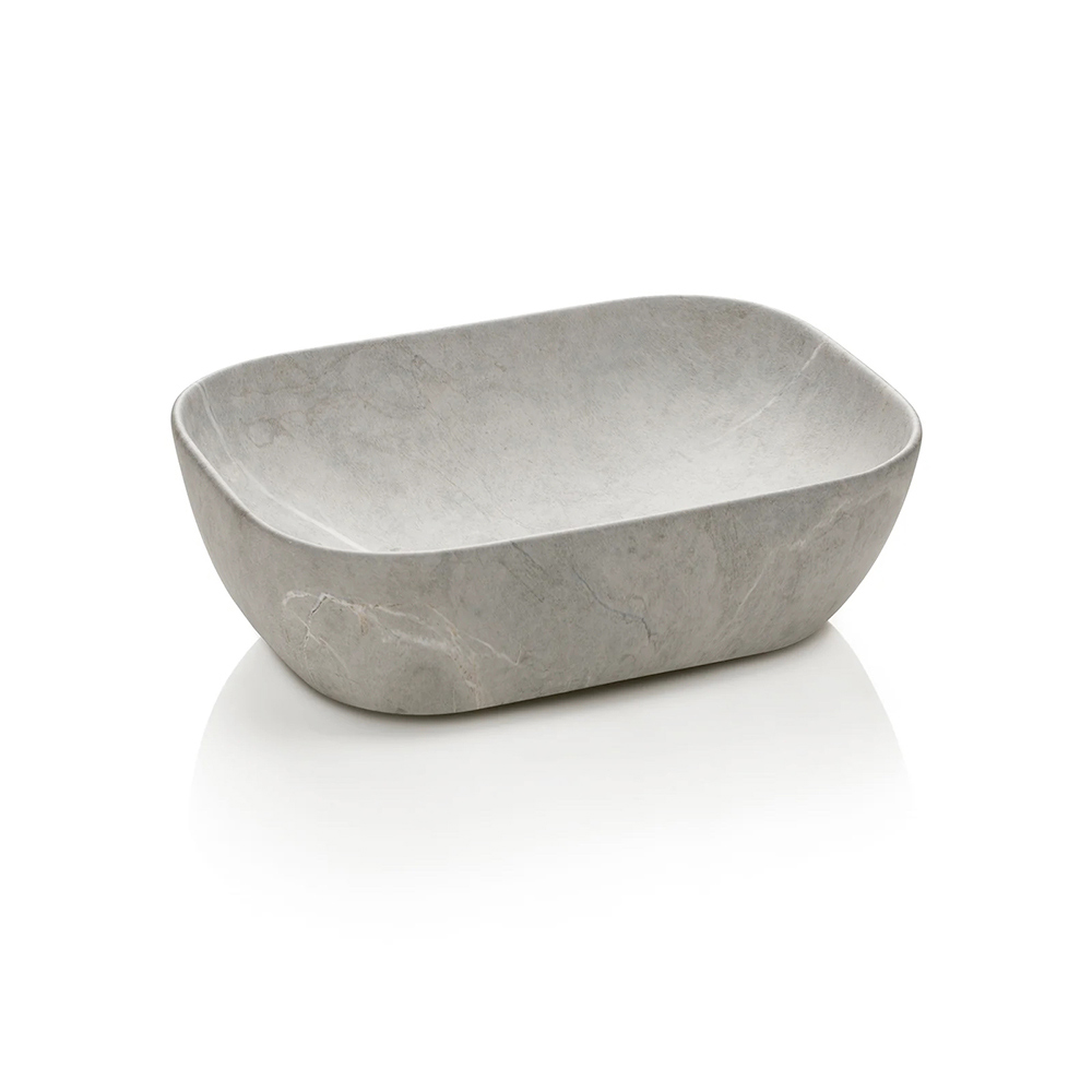 Den grå stenkeramikhåndvask tilføjer et sofistikeret præg af materialitet: kompakt, funktionel og perfekt integreret i kompositionen kombinerer den modstandsdygtighed og stil i ét element.