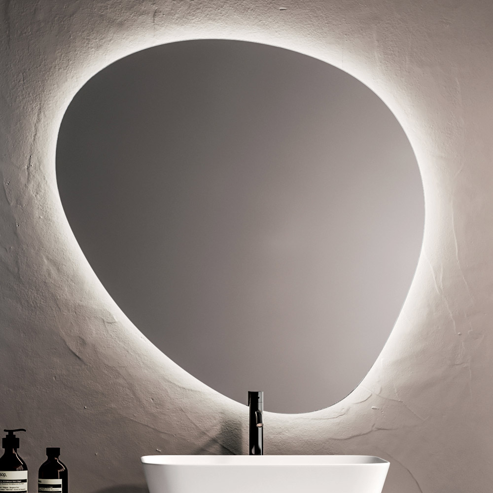 Kompositionens fokuspunkt er det konturerede LED-spejl , der kaster et blødt, omsluttende lys langs kanten, hvilket forbedrer badeværelsesrummet og skaber en elegant og afslappende atmosfære. Den integrerede belysning forbedrer den visuelle komfort og fremhæver rummets moderne fornemmelse.