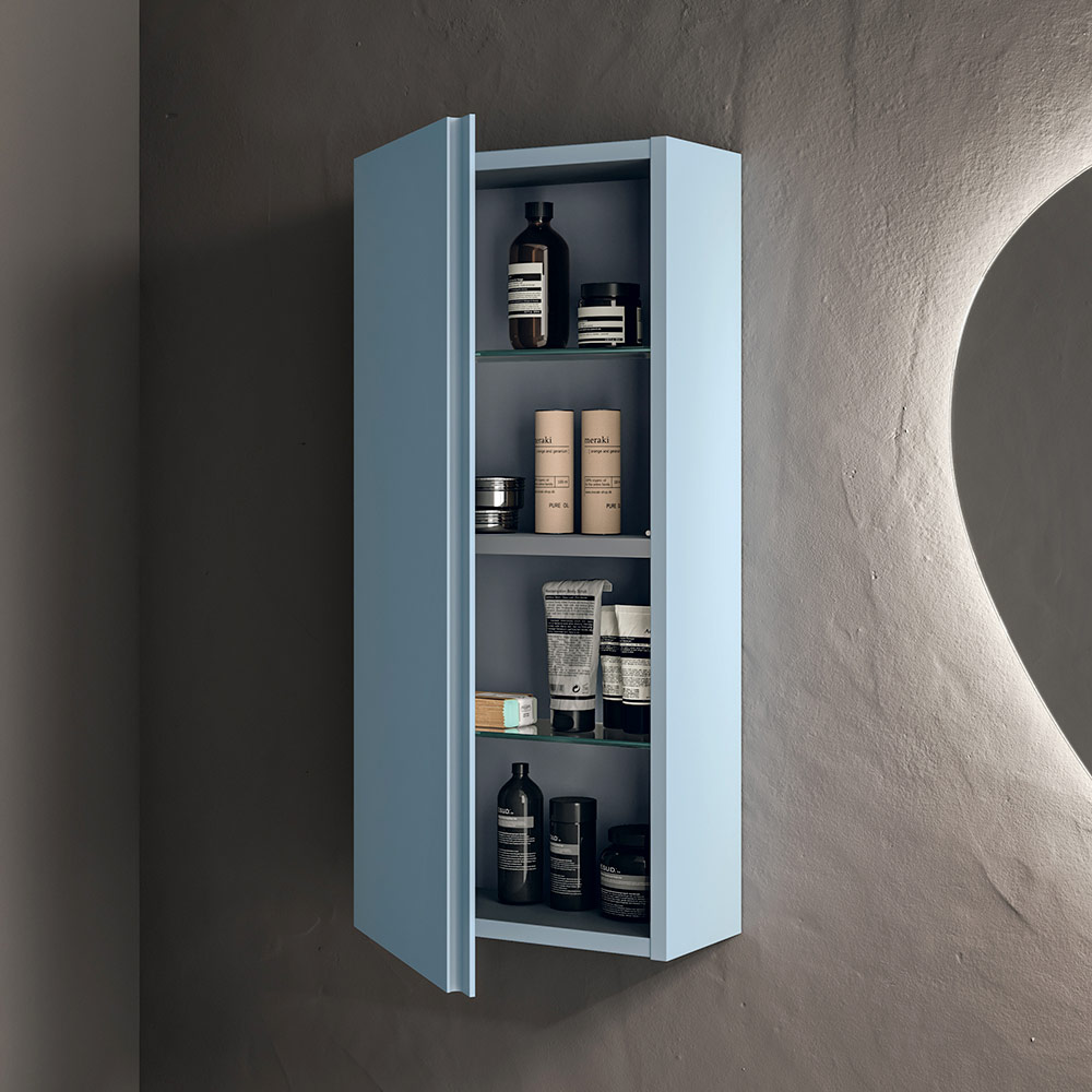 Det koordinerede Tiffany-farvede vægskab fuldender ensemblet og er ideelt til at udvide opbevaringskapaciteten uden at tynge kompositionen ned, samtidig med at det opretholder en raffineret og minimalistisk æstetisk sammenhæng.