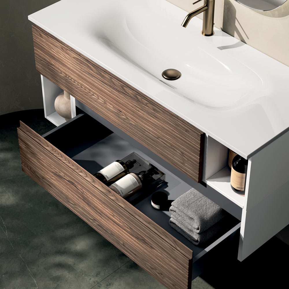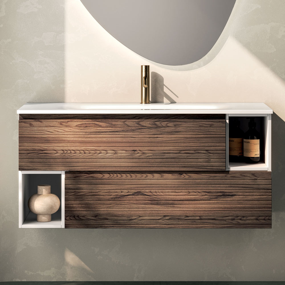 En elegant, ophængt badeværelseskomposition , der kombinerer træets varme med rene, moderne linjer, designet til raffinerede rum med en stærk personlighed.