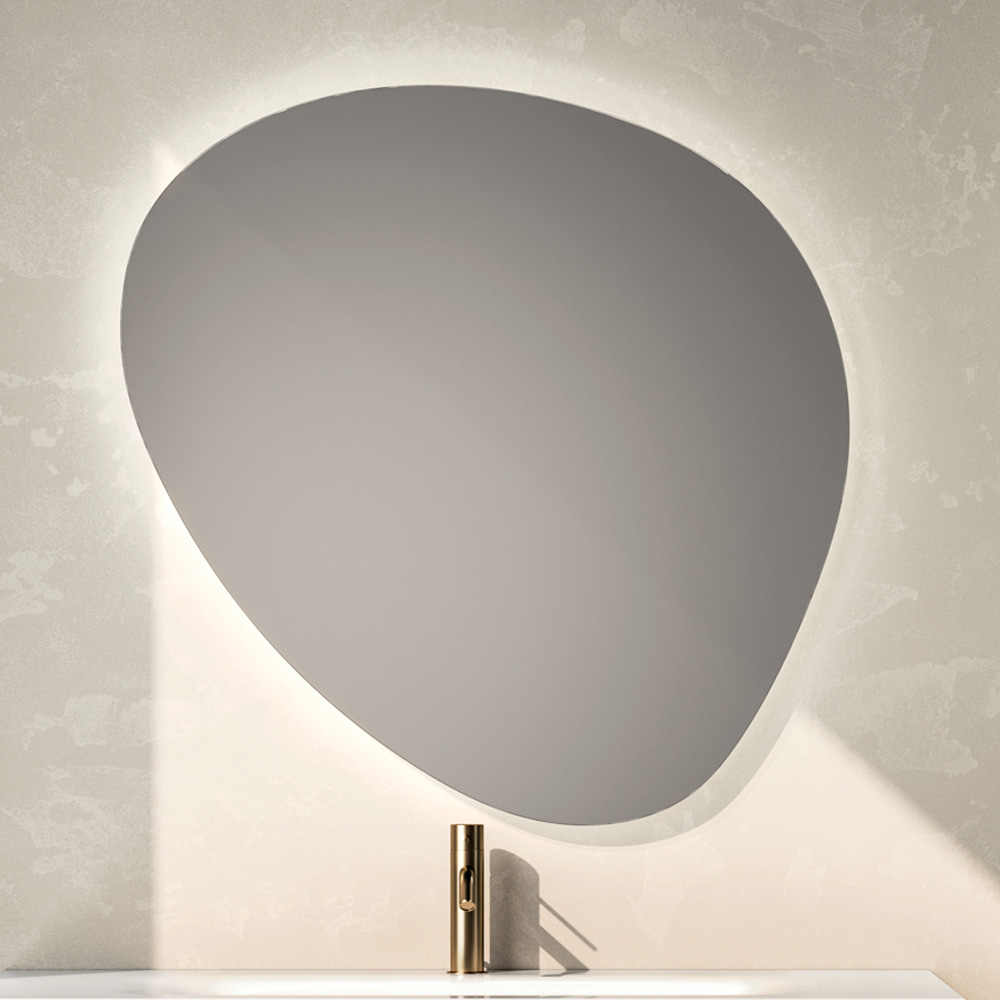 Det formede LED-spejl bliver et sandt møbelelement: dets bløde form og integrerede belysning skaber et raffineret lysspil, der forstærker rumopfattelsen og giver badeværelset dybde.