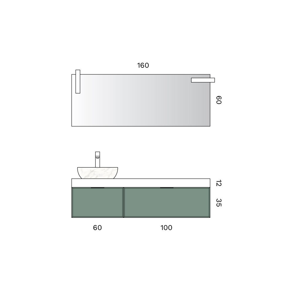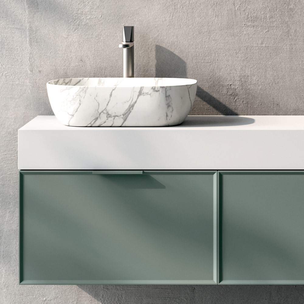 En elegant, moderne badeværelseskomposition , designet til raffinerede, moderne rum. Kombinationen af en mat salviefarvet finish , lyse overflader og klare detaljer skaber en afbalanceret, afslappende atmosfære med en slående æstetik.