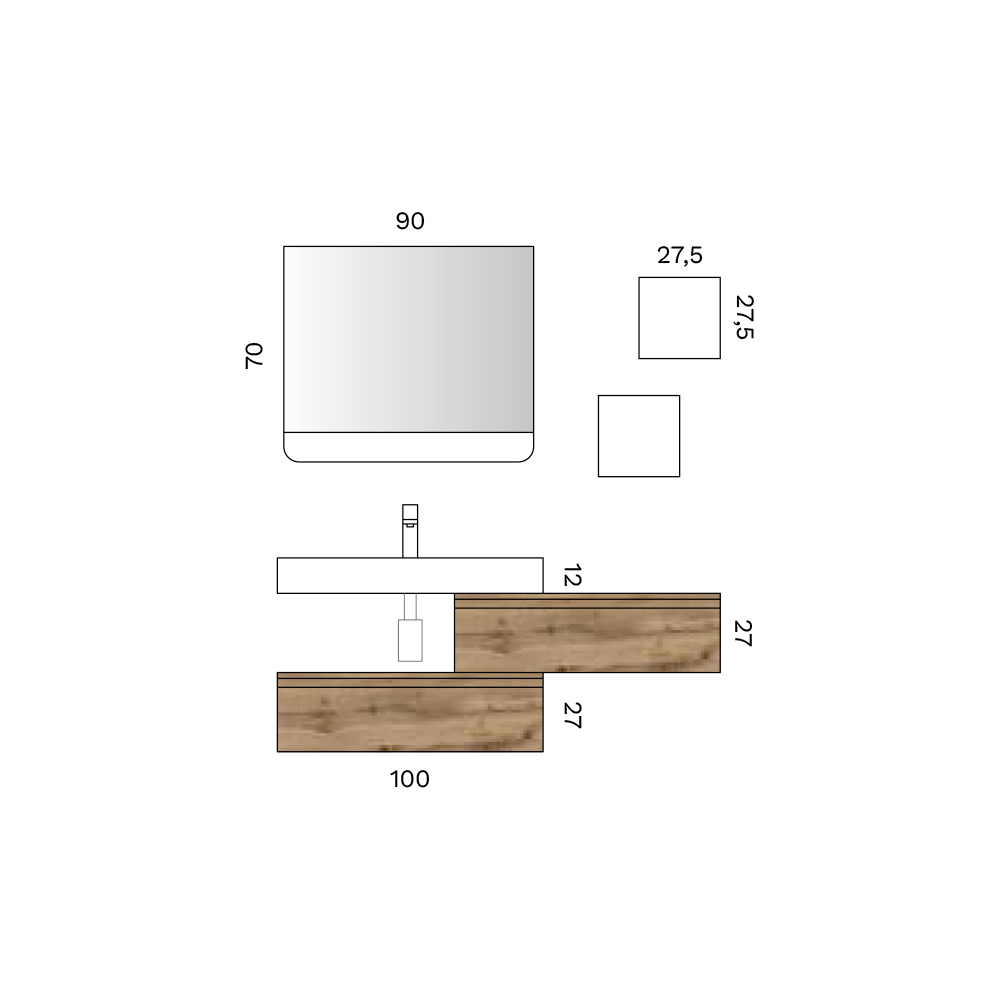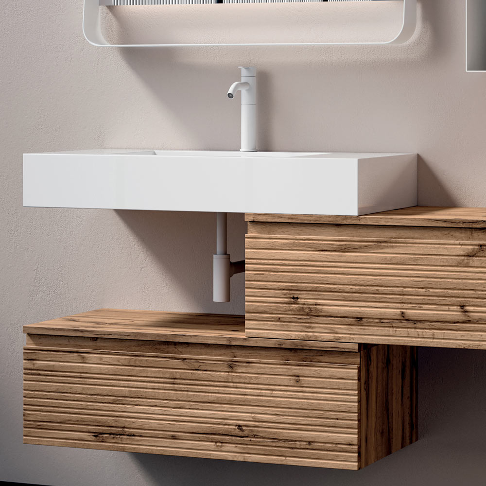 Elegant , ophængt badeværelseskomposition , der kombinerer varmen fra naturligt træ med moderne linjer, ideel til moderne og raffinerede badeværelser.