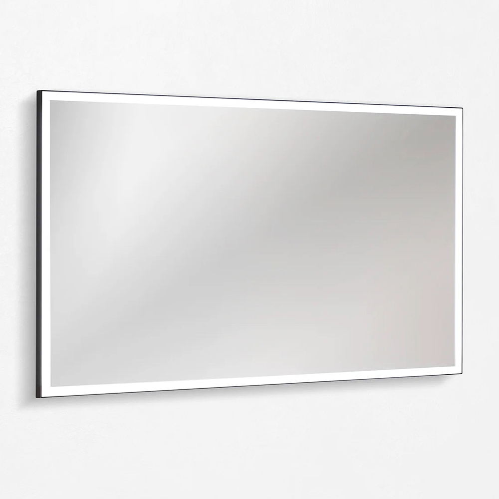 Det matsorte LED-spejl på 120x70 fuldender ensemblet med en elegant og minimalistisk fremtoning, der fremhæver badeværelsesbelysningen og bidrager til at skabe en sofistikeret og moderne atmosfære.