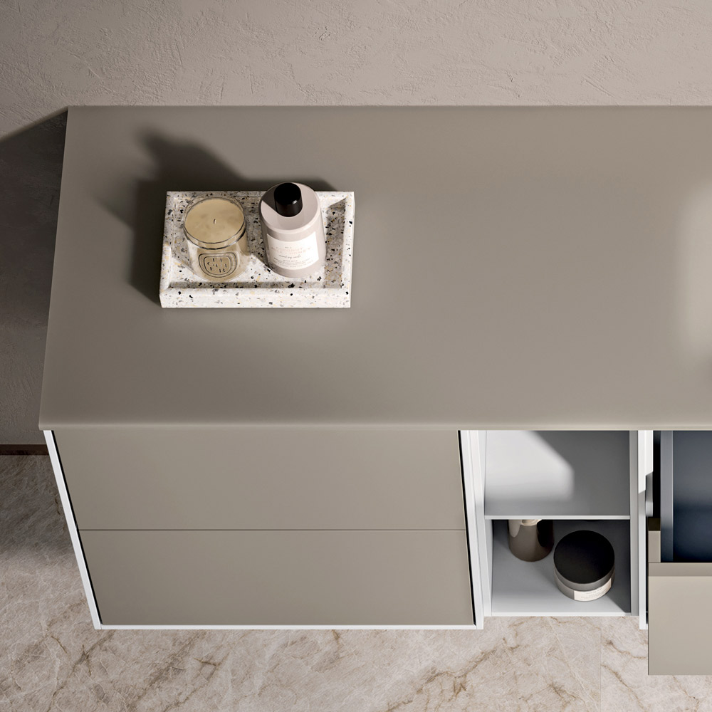 En perfekt løsning for dem, der leder efter et moderne, duegråt, nedhængt badeværelsesskab , der er i stand til at kombinere minimal æstetik, raffinerede materialer og maksimal praktisk anvendelighed i hverdagen.