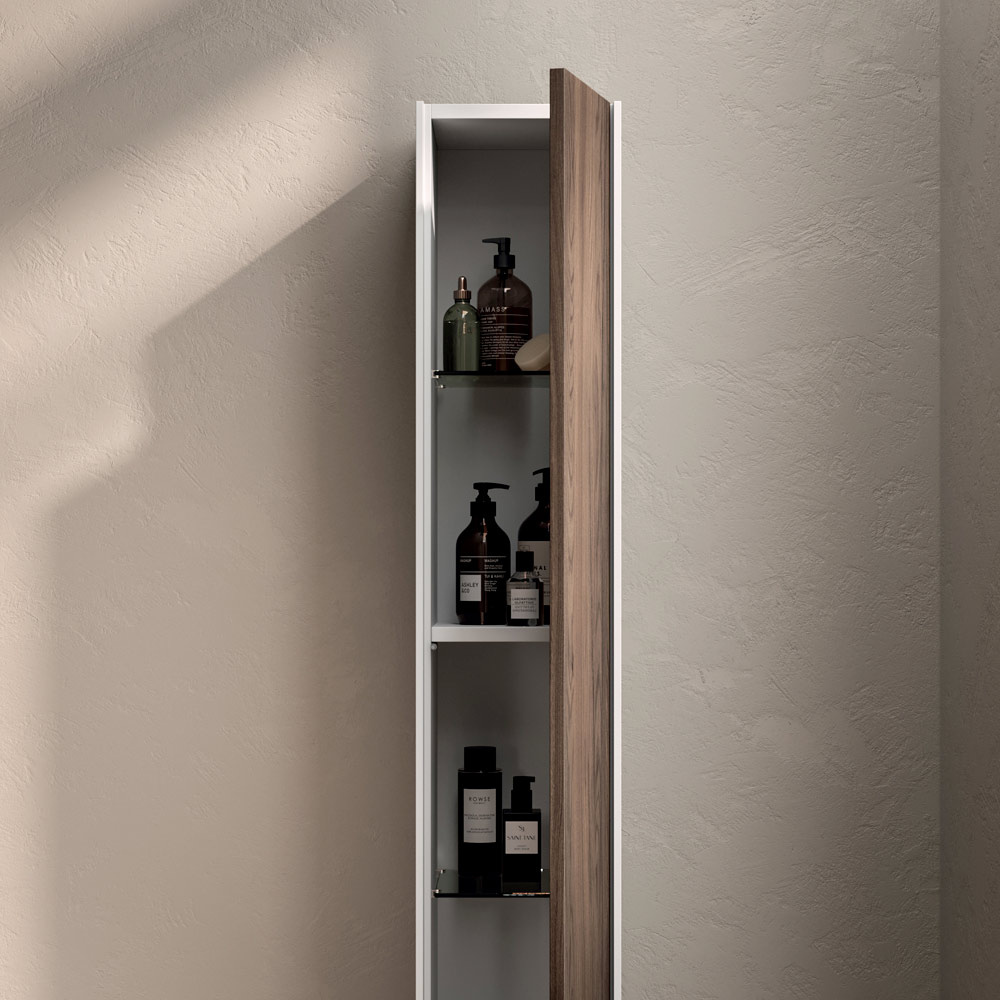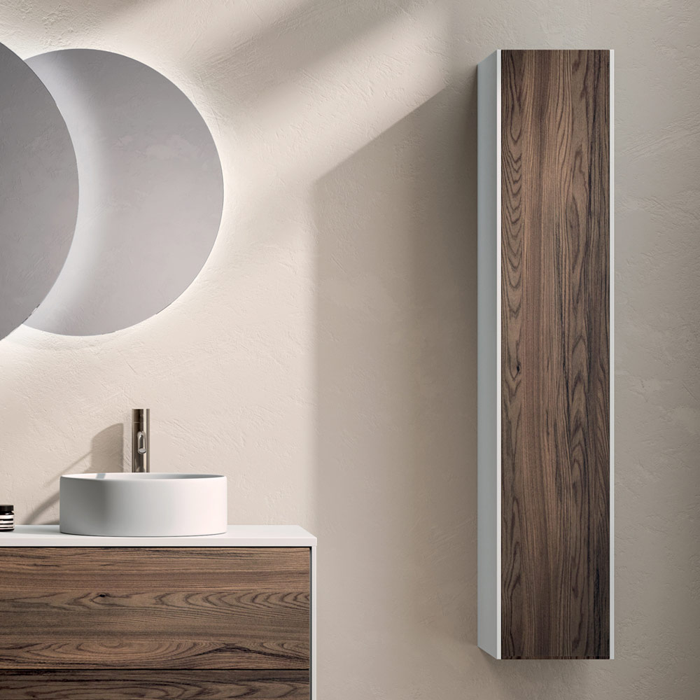 Den matchende søjle fuldender kompositionen og tilføjer vertikalitet og orden til et badeværelsesprojekt designet til dem, der ønsker elegance, praktisk anvendelighed og æstetisk sammenhæng.