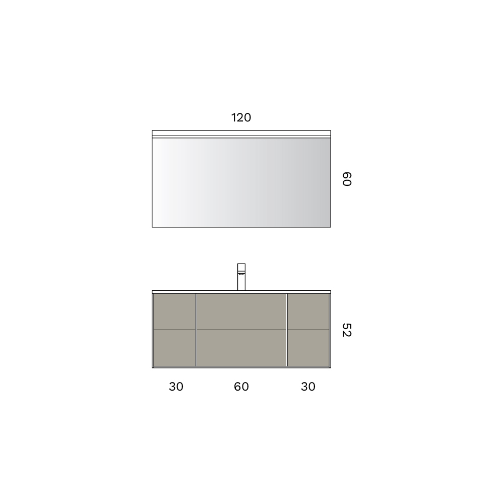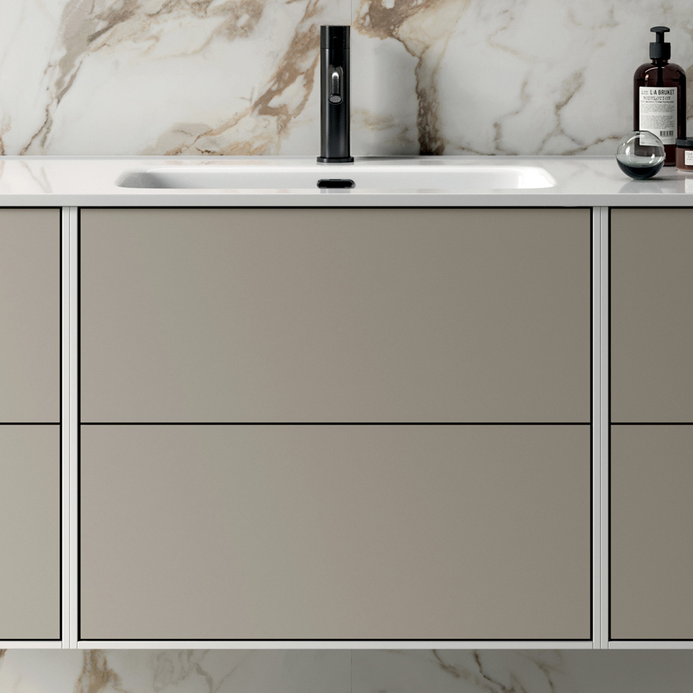 En moderne badeværelseskomposition, der perfekt balancerer elegance og funktionalitet. Den matte, duegrå finish på de vægmonterede skabe skabe skaber en sofistikeret og afslappende atmosfære, ideel til moderne og raffinerede rum.