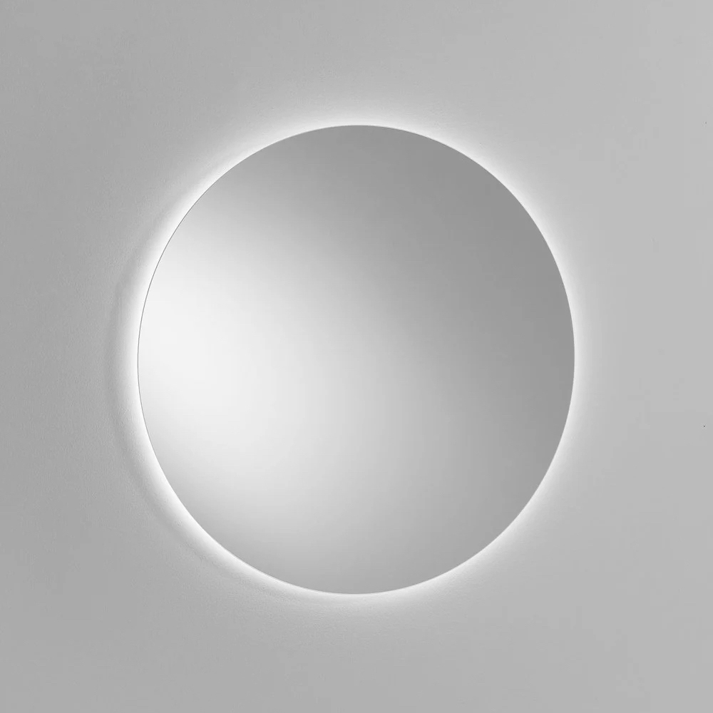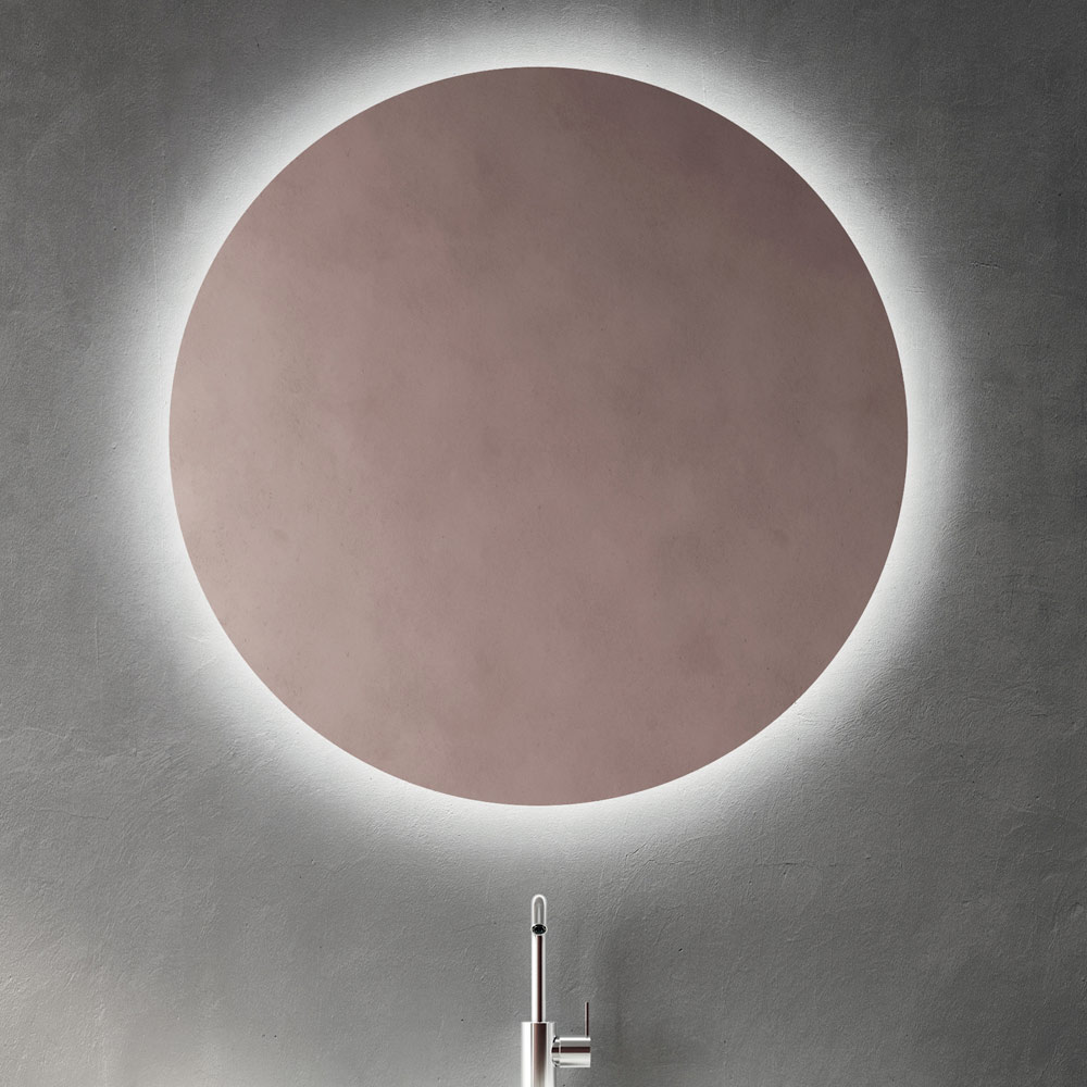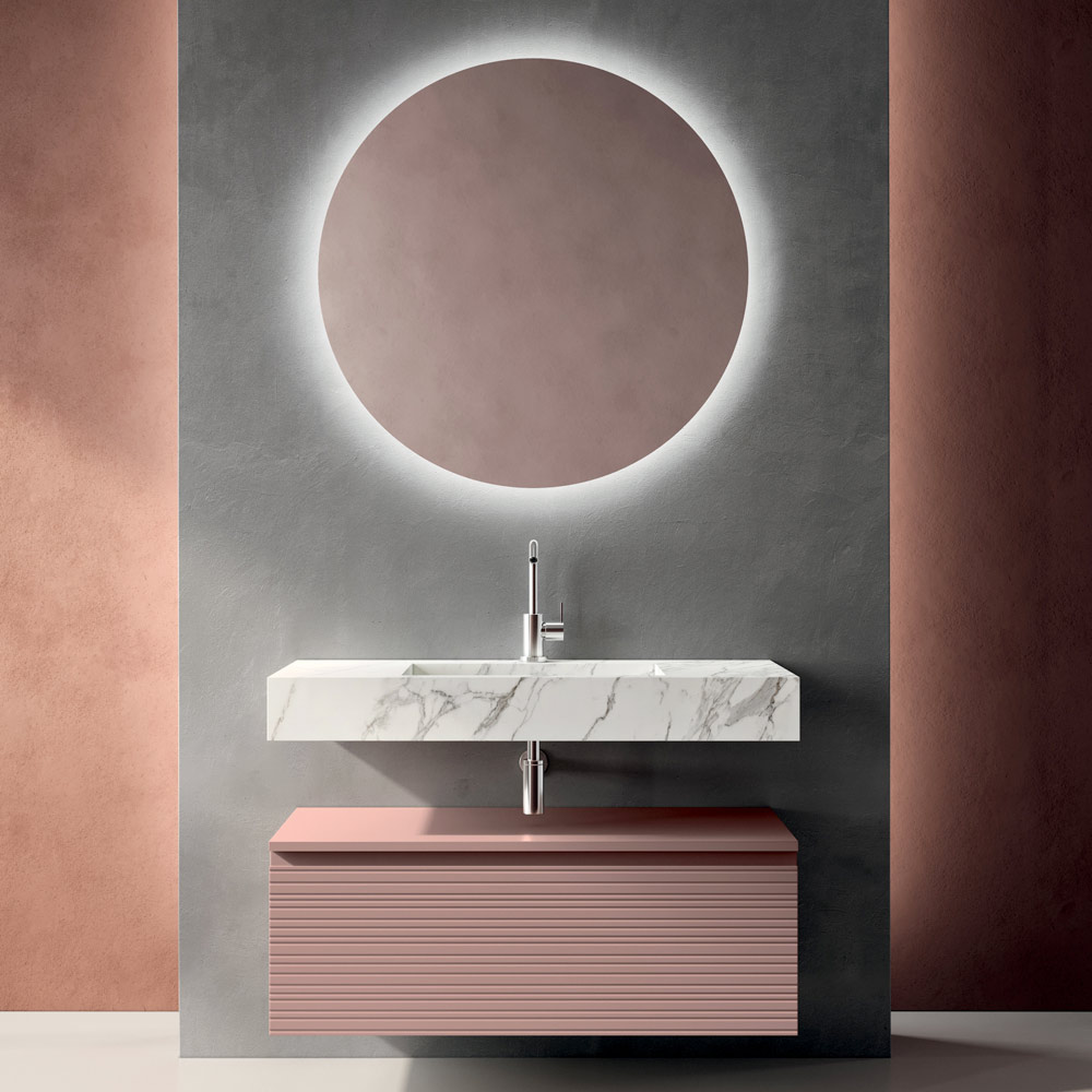 Det runde LED-baggrundsbelyste spejl indtager en central plads på væggen og tilbyder et diffust, omsluttende lys, der fremhæver vaskeområdet og hjælper med at skabe et elegant og dramatisk badeværelsesmiljø.