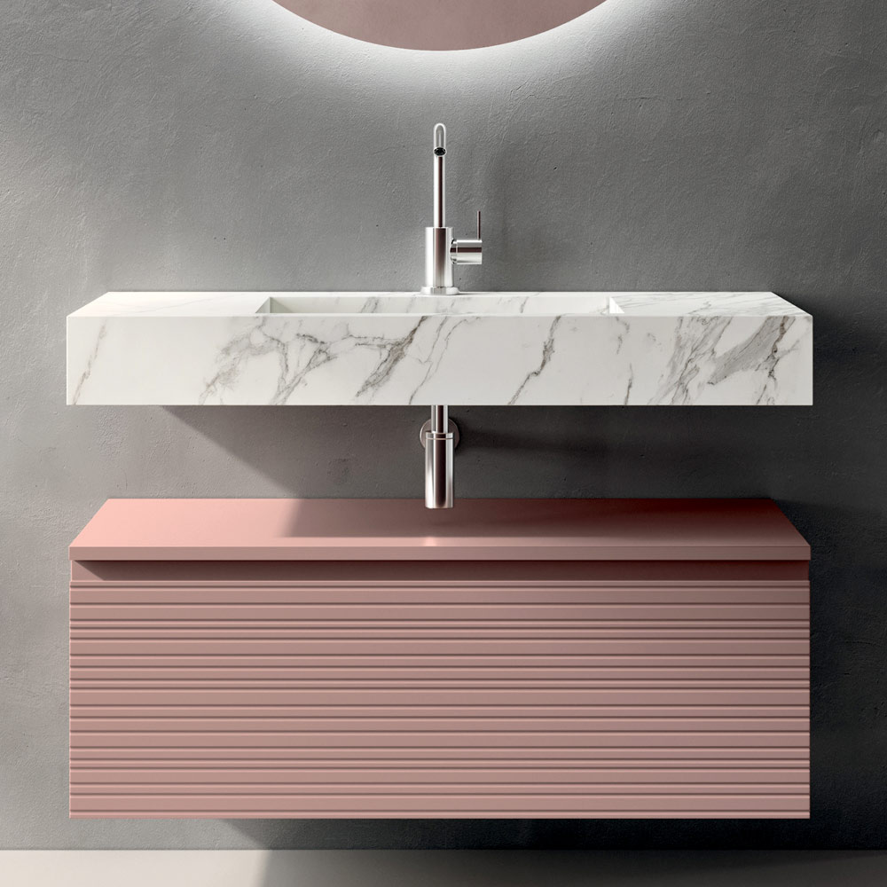 Det væghængte badeværelsesskab i pudderrosa med en rummelig og funktionel skuffe tilbyder en praktisk og æstetisk harmonisk opbevaringsløsning. Den matte finish fremhæver farven med en blød og sofistikeret tekstur, der er perfekt til at skabe en indbydende og lys atmosfære.