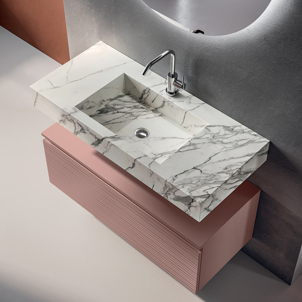 HPL-håndvasktoppen med calacatta-look introducerer et materiale med stor visuel effekt: den marmorinspirerede æstetik giver lysstyrke og værdi, samtidig med at den opretholder høj ydeevne med hensyn til modstandsdygtighed og praktisk anvendelighed til daglig brug.