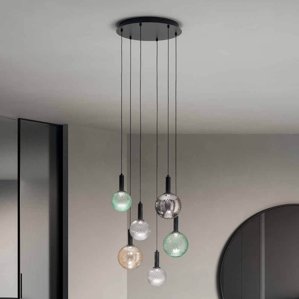 Perfekt over et spisebord eller som omdrejningspunkt i en moderne stue , hver kugle er hængt op med præcision, hvilket skaber en komposition, der er lige så kunstnerisk som den er funktionel . De forskellige glastoner giver et strejf af klasse og distinktion til ethvert rum og reflekterer lyset på måder, der fanger øjet og oplyser rummet.
