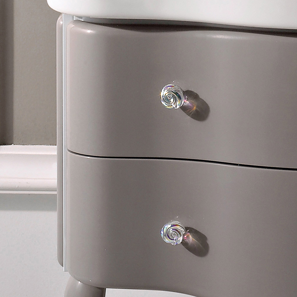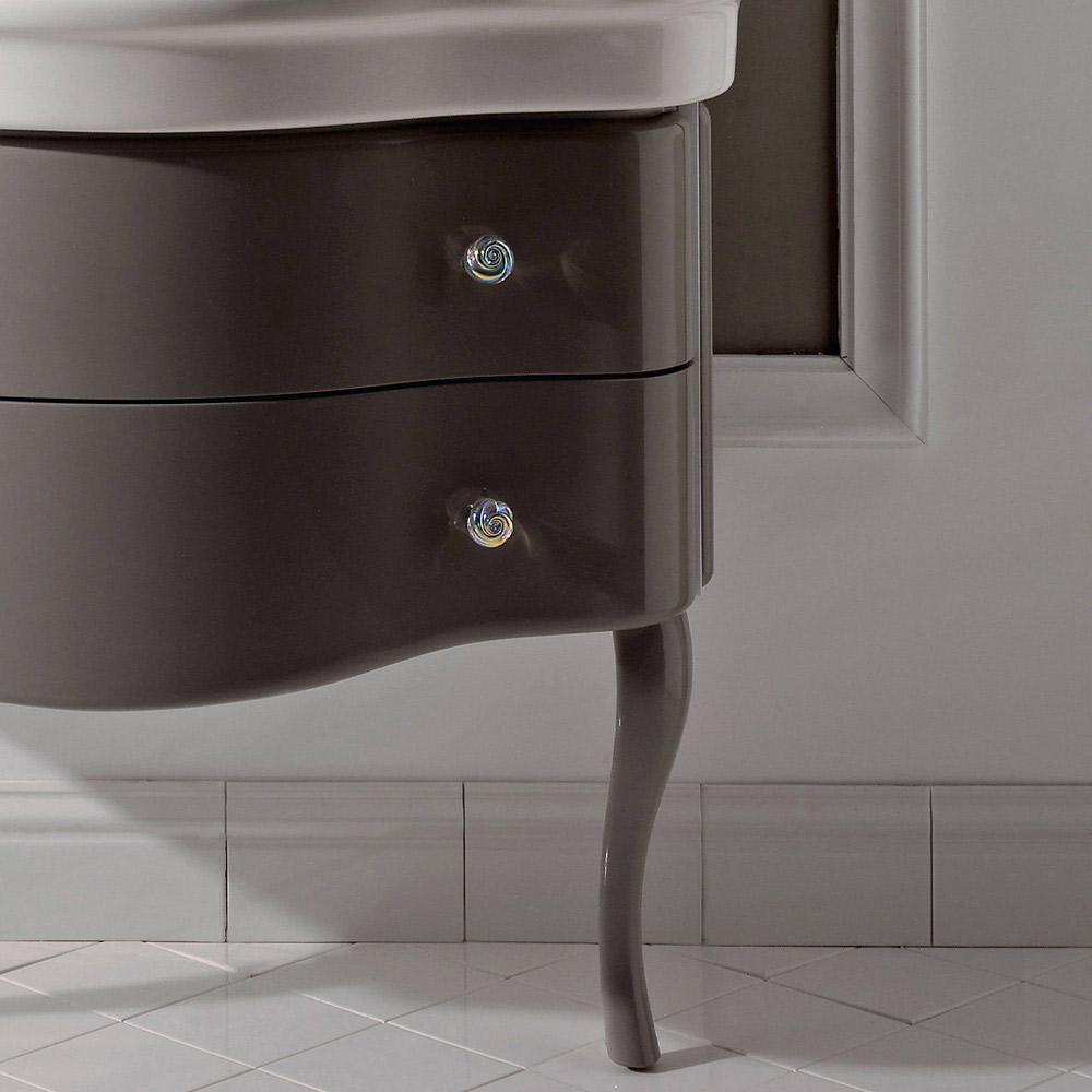 MDF badeværelsesskab med to blanklakerede skuffer , med hvid keramisk vask . Skabet er tofarvet: låger og ben er taupe-farvede, mens strukturen er tjørnfarvet, de roseformede messingknopper medfølger.