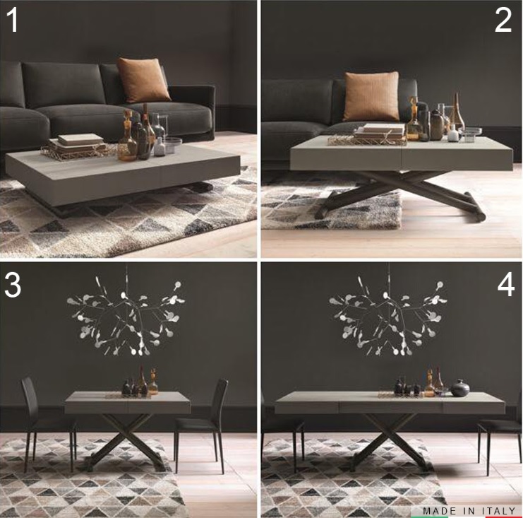 Dette er grunden til, at vi foreslår den nye og unmissable opfattelse af design og pladsbesparende: de transformerende sofaborde, der bliver spiseborde. De er designet til at blive brugt i enhver situation og frem for alt med ekstrem lethed; Disse borde kan kun løftes med et let tryk på hånden og kan låses i enhver højde og bliver også aperitifborde og ikke kun de klassiske spiseborde.