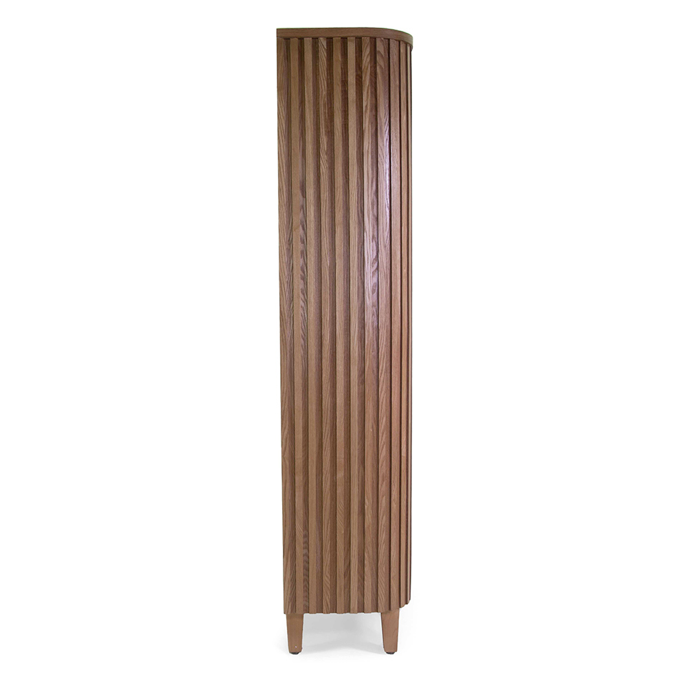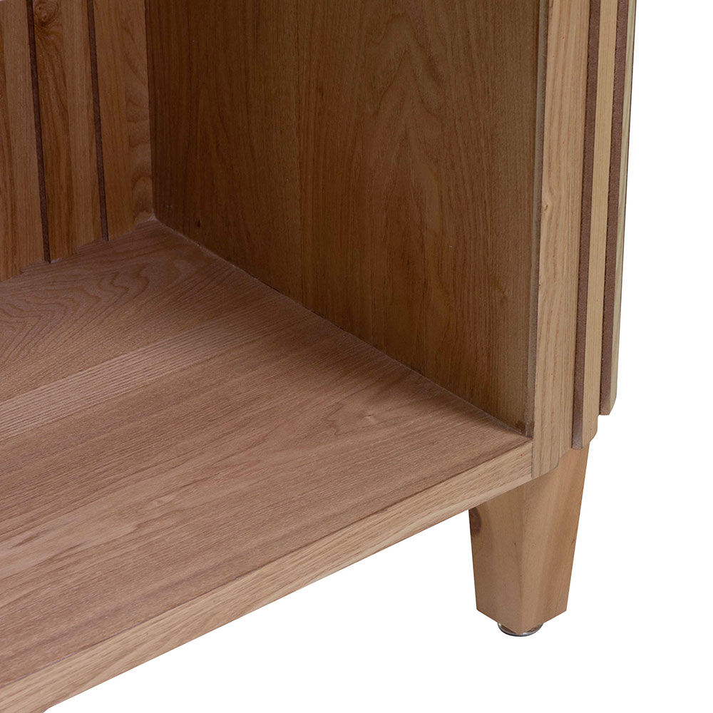 Denne elegant designede reol er fremstillet af MDF-finer med en finish, der fremkalder varmen og ægtheden fra naturligt træ. Dens massive fyrretræsben sikrer stabilitet og holdbarhed, hvilket gør den til et perfekt valg til ethvert rum. De lodrette linjer på sidefladerne tilføjer et strejf af håndværksmæssig raffinement , mens de rummelige, åbne hylder giver rigelig plads til at vise bøger, dekorative genstande eller planter. Denne reol er ideel til at forbedre stuer, kontorer eller læsehjørner og kombinerer funktionalitet og moderne stil til en indretning, der skiller sig ud.