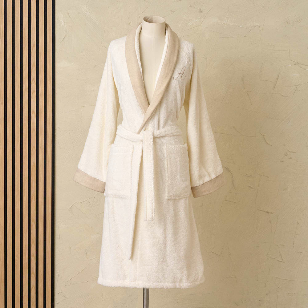 Sjalkrave-badekåbe i blød ren bomuldsfrotté med flæser i rent hør og monogram broderet på brystet af italienske eksperter.