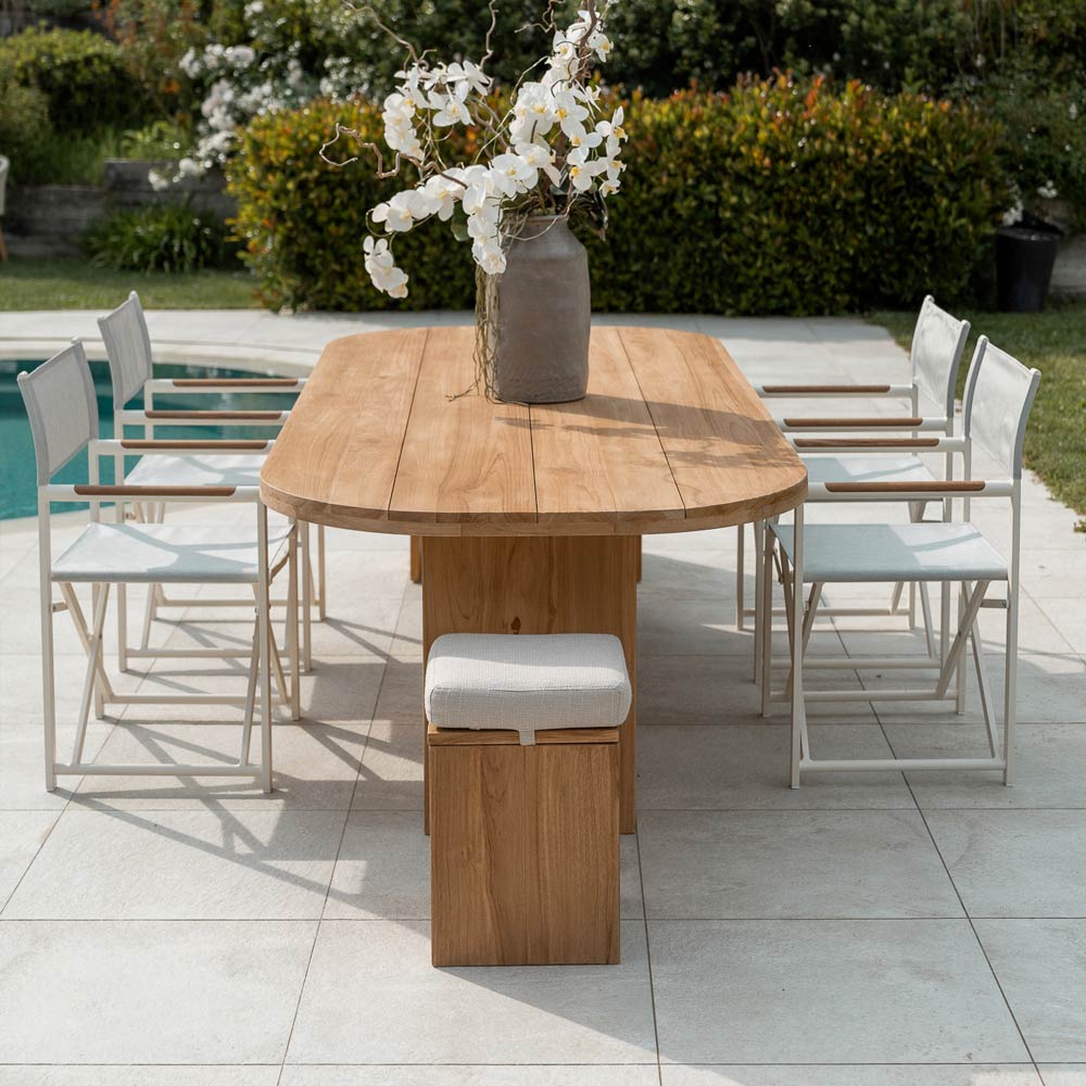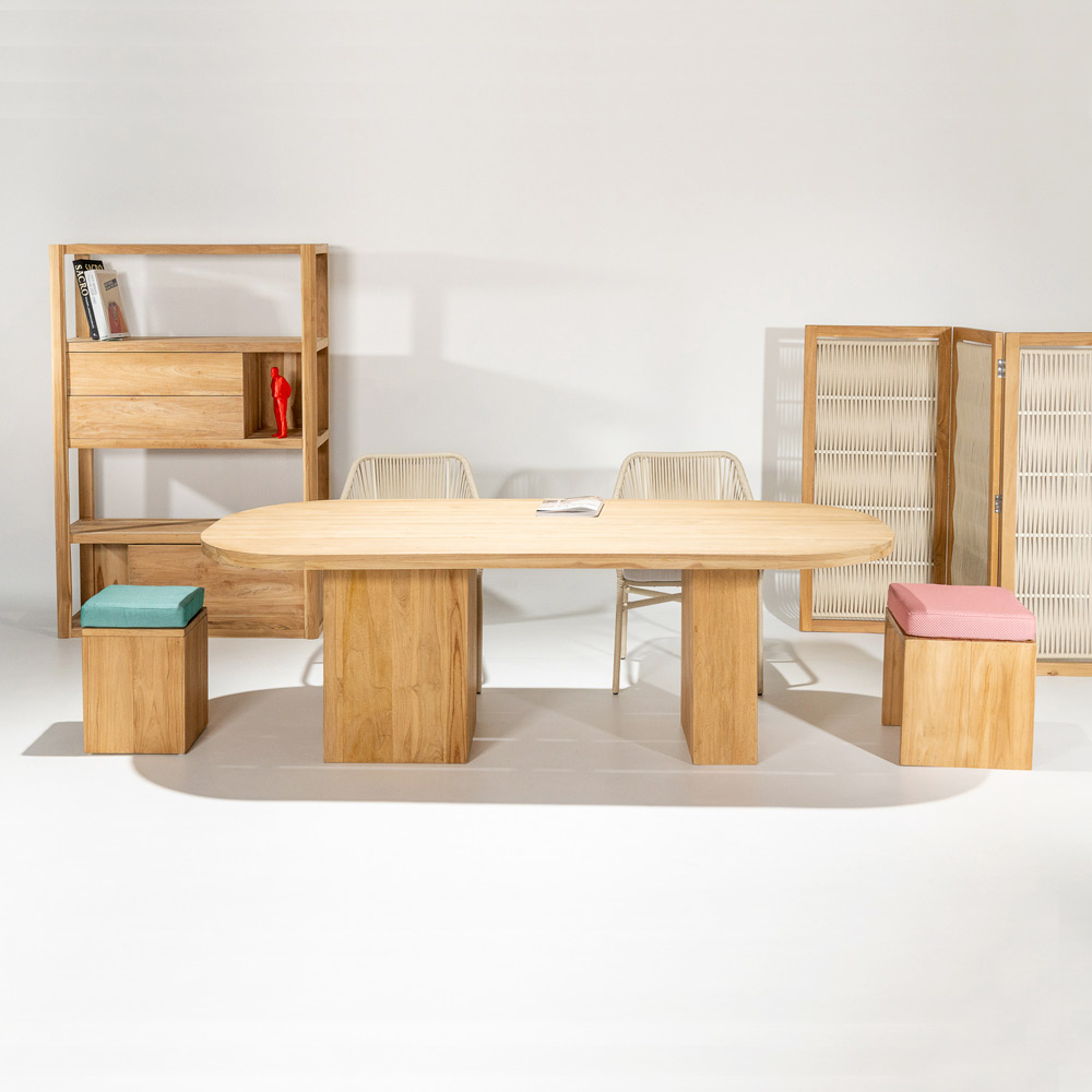 enkelt, men harmonisk proportioneret element , der er velegnet til ethvert udendørsmiljø, såsom terrasser, verandaer, haver eller ved poolen, for at skabe en betagende atmosfære. Teaktræet, der er anvendt i dets konstruktion, garanterer