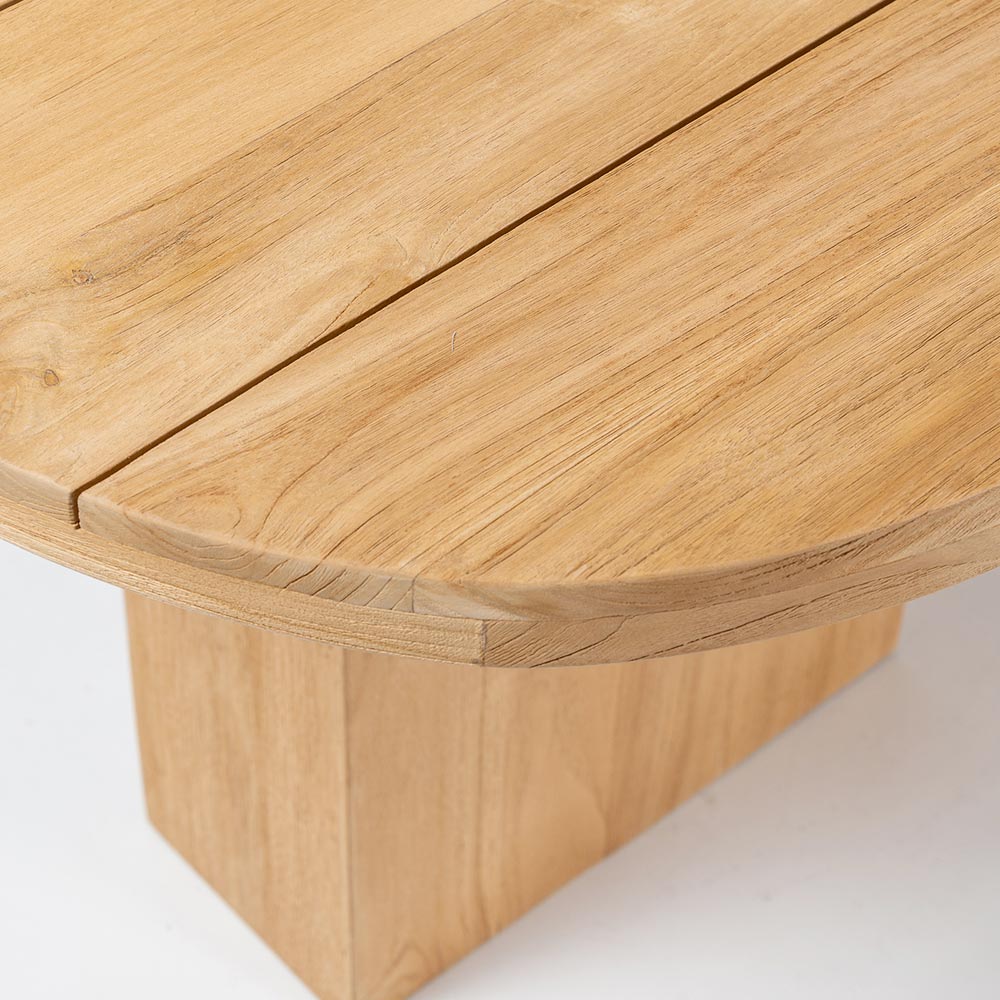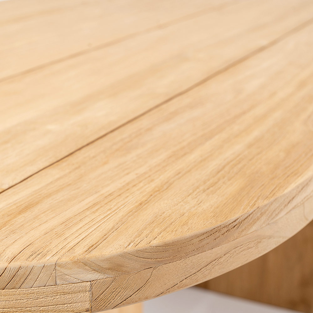 Bord med bordplade i børstet teaktræ med langsgående lameller og afrundede hjørner.