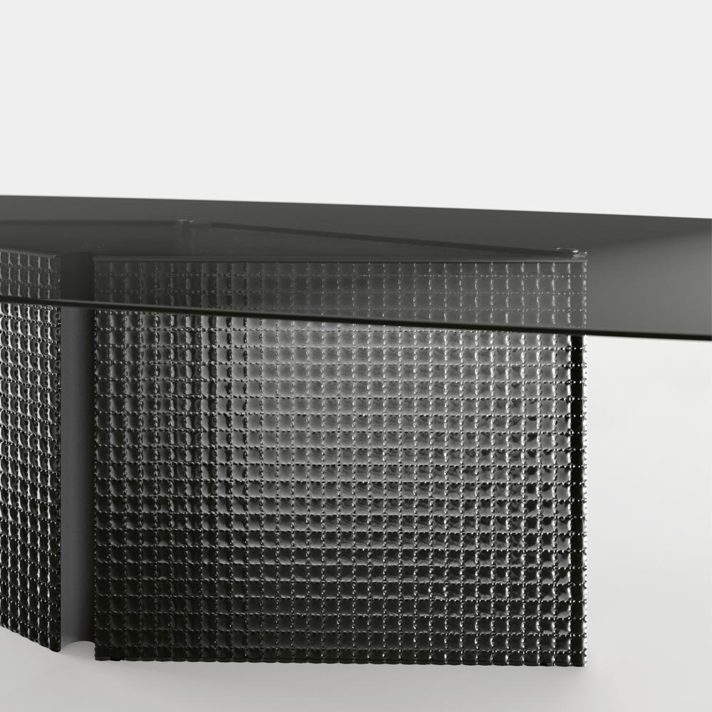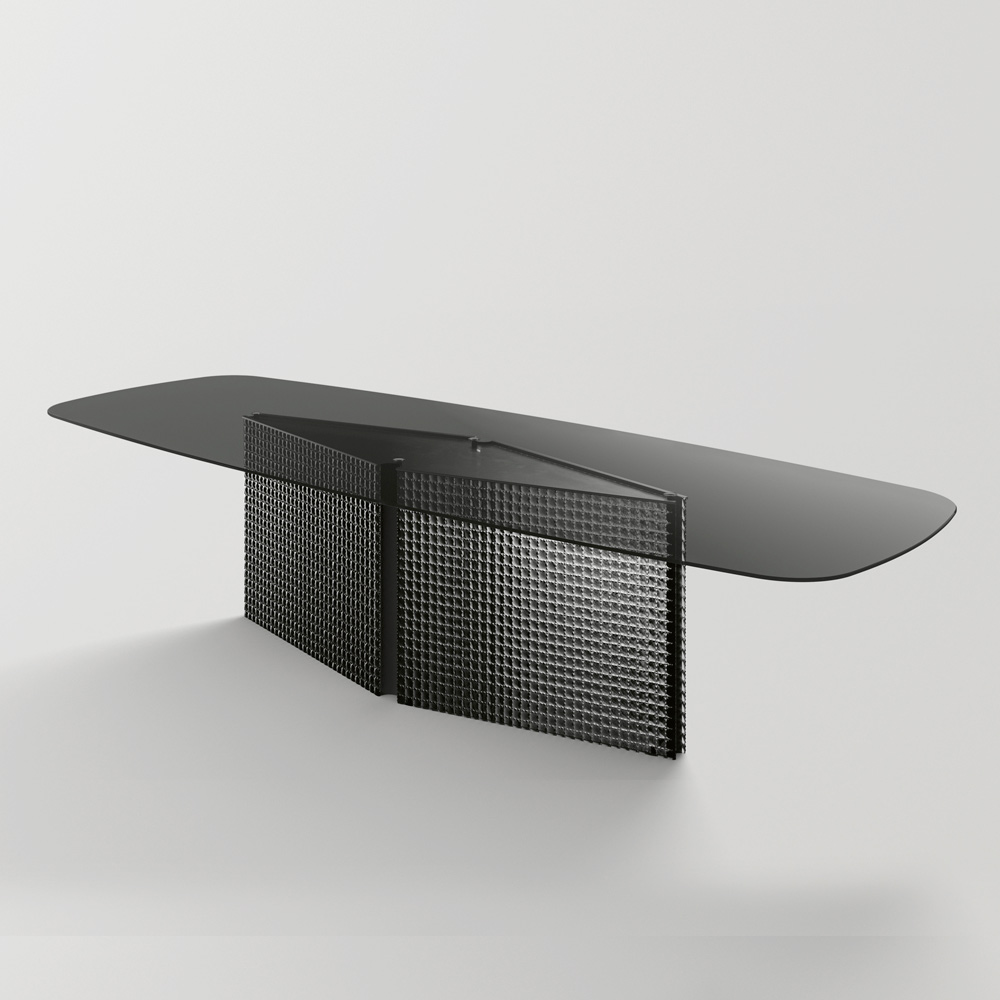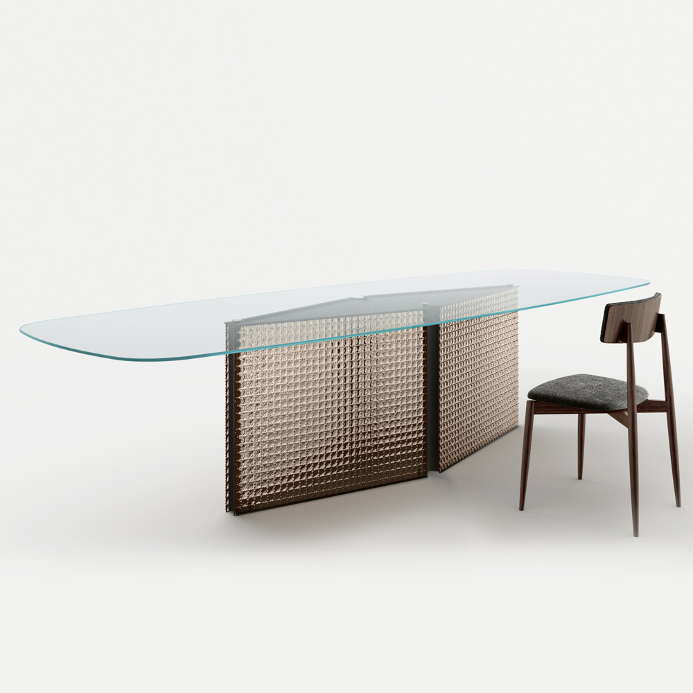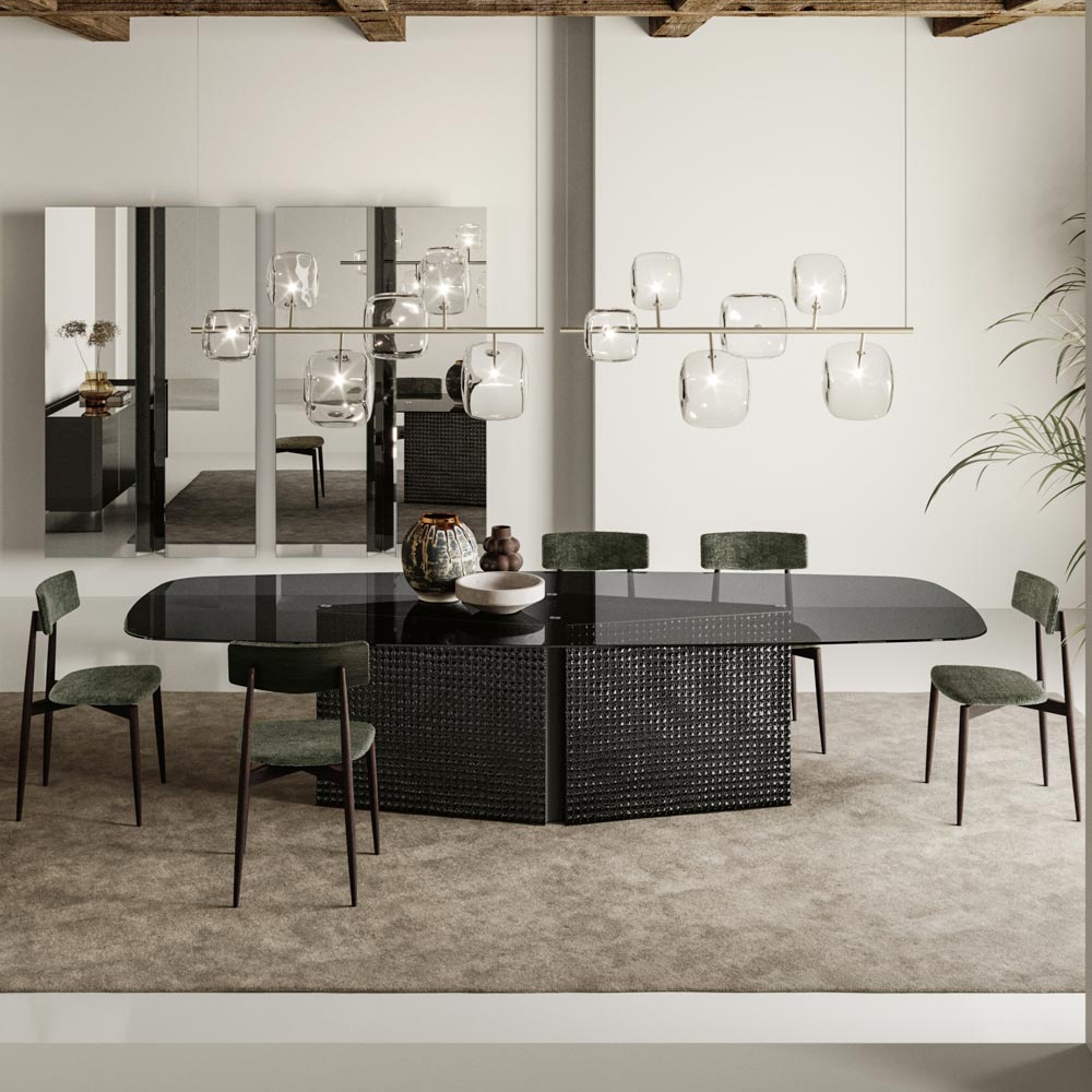 Dette spisebord er et eksempel på avantgarde design, der blander elegance og funktionalitet . Dens slanke, aflange silhuet med en glasplade tilbyder en glat, raffineret overflade, ideel til formel spisning eller som et fokuspunkt i et moderne designrum.