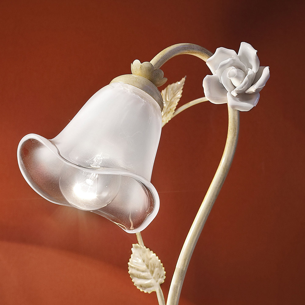 Bordlampe i jern, glas og keramisk rosedekoration lavet i Italien af Ferroluce.