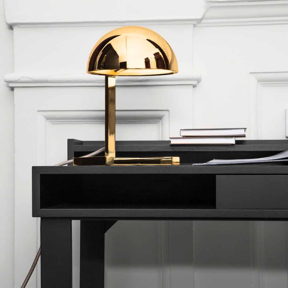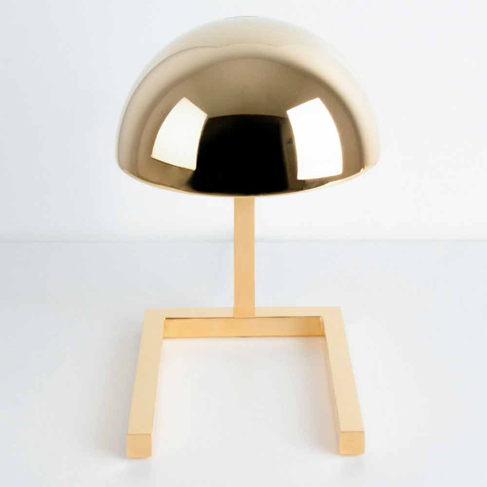 Bordlampe helt lavet i Italien i poleret messing med 140 cm gennemsigtigt kabel udstyret med ON-OFF-knap . Dens design har brugen af forskellige geometriske former, der skaber et vidunderligt harmonisk resultat med en næsten futuristisk æstetik. Dens struktur er dannet af en sfærisk hætte, der er placeret på en piedestal med en firkantet figur, der giver liv til en original og kreativ lysidee, ideel til både hjemmemiljøer og til studier eller kontorer, hvor det vil bidrage til at berige møblerne takket være en ekstremt elegant og raffineret touch .