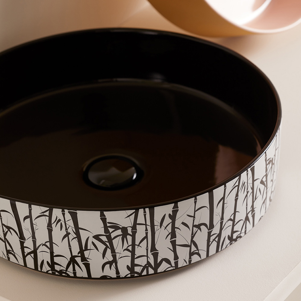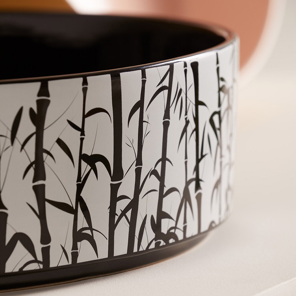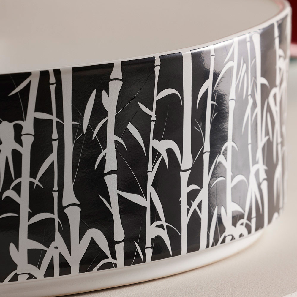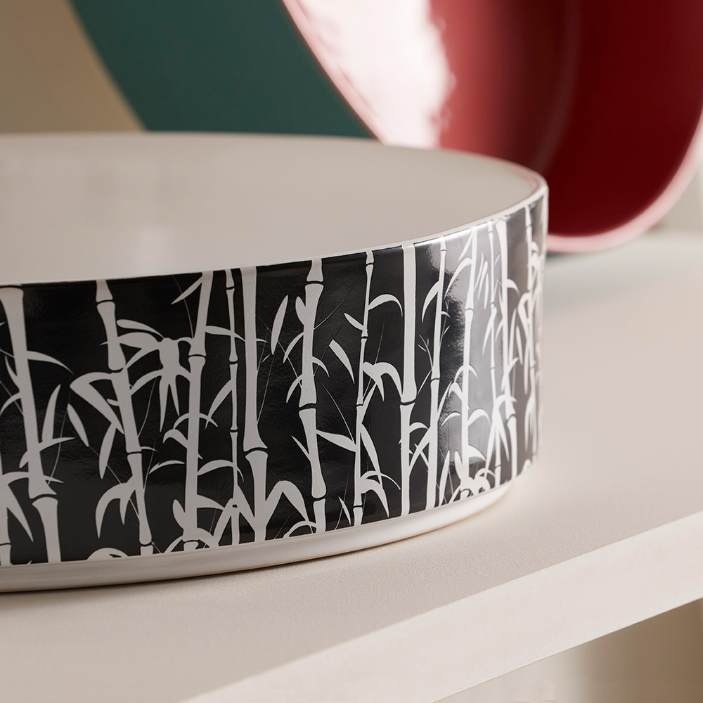 - blank sort indvendig, udvendig hvid negativ reliefdekoration på matsort emalje (sort bambus)