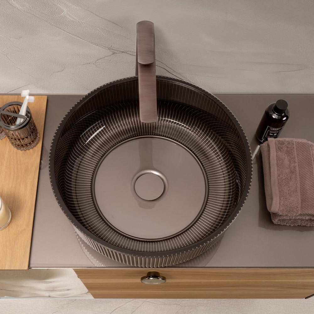 Vasken fås i sofistikerede farveversioner og tilpasser sig både klassiske og moderne omgivelser, og giver altid en eksklusiv og raffineret karakter. Farverne kombineret med glassets naturlige lysstyrke giver dybde og bevægelse og forvandler vasken til et sandt dekorativt kunstværk.