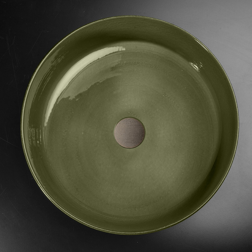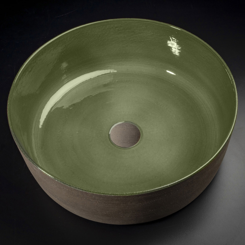 Bordvask med rund form lavet i Italien i ildfast ler , drejet i hånden med tredje ild madlavning. Dens æstetik er kendetegnet ved den perfekte kombination af det naturlige voksede og vandtætte ydre med en mere rustik stil og det blanke og glaserede interiør i en grøn finish, en farve, der minder om foråret og planternes blomstring, hvilket bringer tilbage til den oprindelige kontakt med naturen ... Hvert element i håndvasken er håndlavet for at give liv til en eksklusiv indretningsløsning, af høj værdi og af uovertruffen kvalitet.