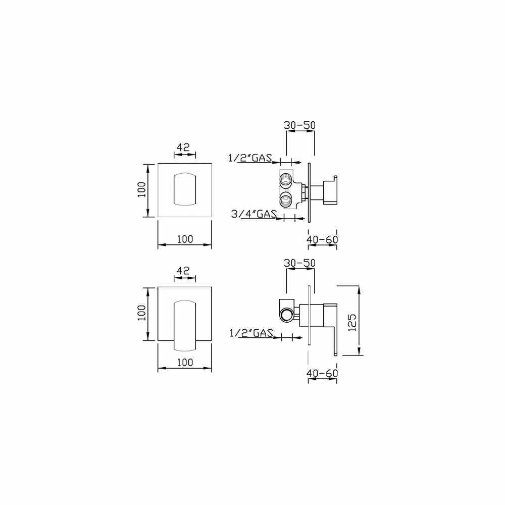 brusearmatur med 5-vejs omskifter komplet med indbygningsdel og udvendige dele.